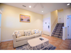 One more flight up brings you to the loft, a bright sitting area with a bird's-eye view of the living space below. This space includes a TV, a small table for games, and a sleeper sofa for additional guests.