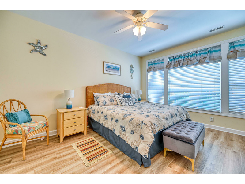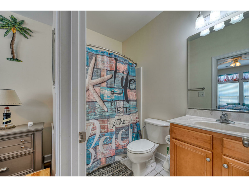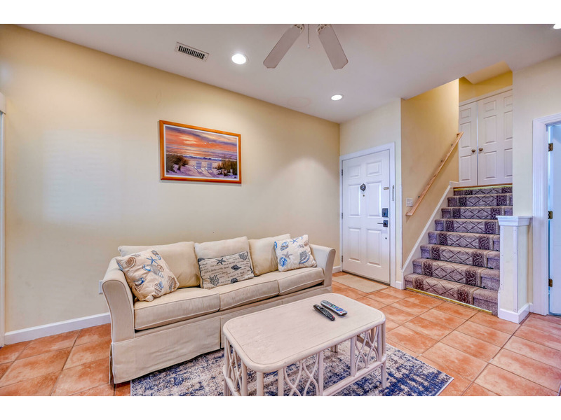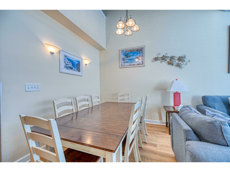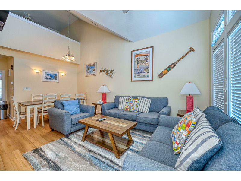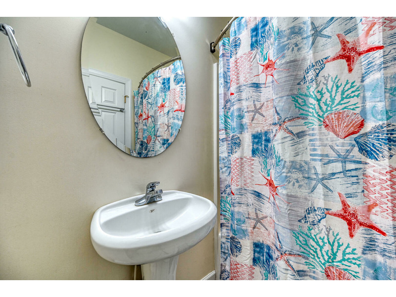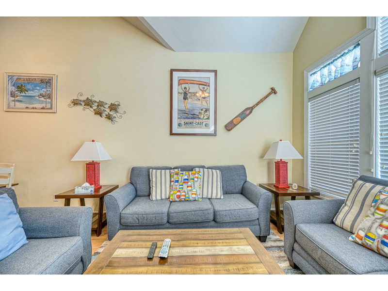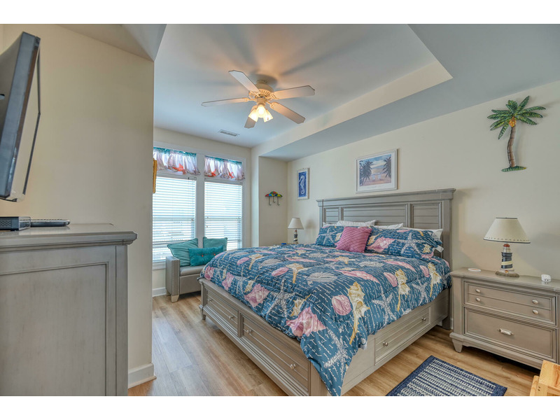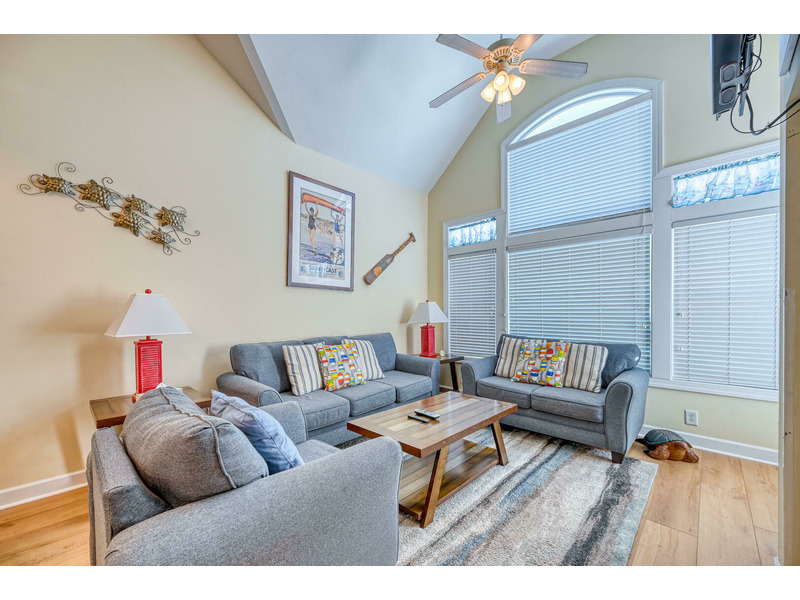 When you arrive, you'll enter on the main sleeping level. Here, a cozy sitting area provides a great spot to unwind before bed, complete with a flat-screen TV, DVD player, and a sleeper sofa for extra guests. French doors open to a covered deck overlooking the pool, so you can keep an eye on the fun while enjoying the breeze. This level also features two bedrooms: one with a king bed, TV, and private full bath, and another with a queen/twin bunk bed and single twin bed and its own full bath. Ceiling fans in every bedroom keep you cool and comfortable.