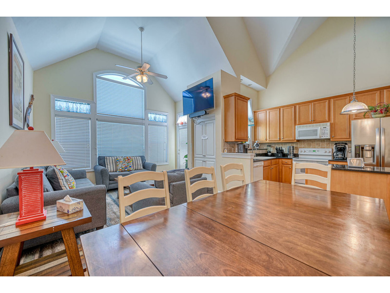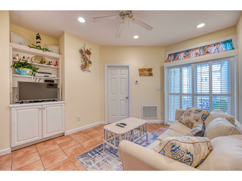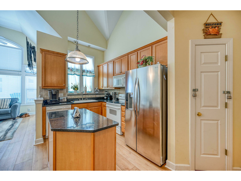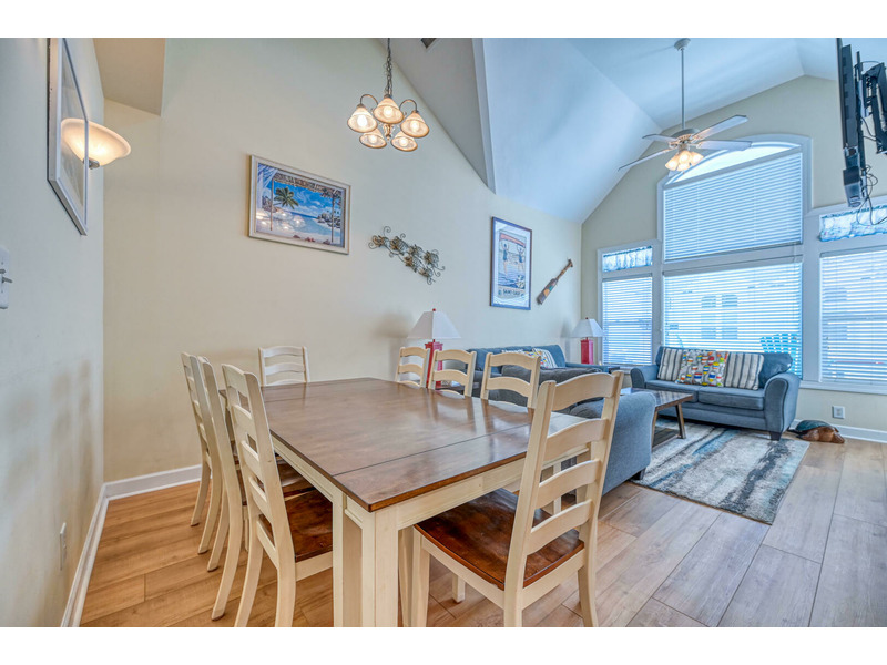 Head upstairs to the main living level, where an open floor plan creates the perfect space for gathering. The fully equipped kitchen offers everything you need for meal prep and entertaining, with plenty of storage and a separate dining table for family meals. The living room features ample seating, a large flat-screen TV, and access to an upper deck with beautiful ocean views - 2014ideal for sunbathing or enjoying a Topsail sunset. Wireless internet keeps you connected (but we recommend leaving work behind!). A half bath and laundry closet with full-size washer and dryer are also located on this level for convenience. The third bedroom is here as well, offering a king bed, TV, ceiling fan, and private full bath.