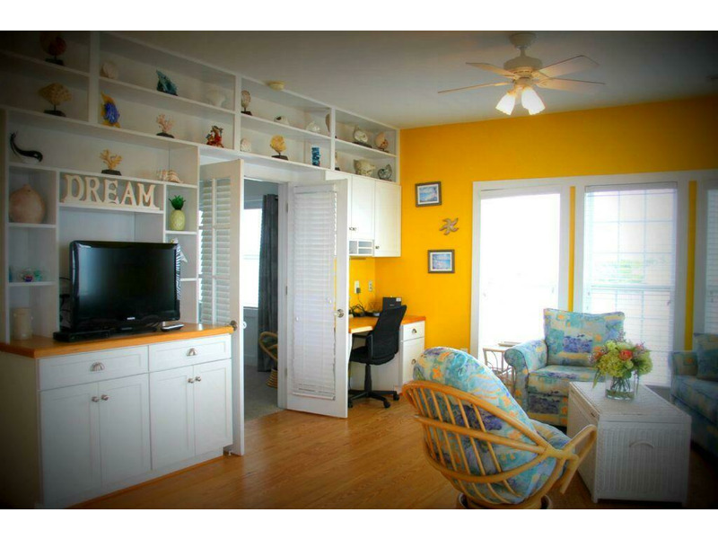 The open-concept living room welcomes you with comfortable seating, a flat-screen TV with cable, and a sleeper sofa for additional guests. Stay connected with complimentary Wi-Fi and share your beachside memories in real time. Just off the living area, the fully stocked kitchen has everything you need to prepare meals and entertain, with ample storage and a dining table for gathering and sharing stories from your day.