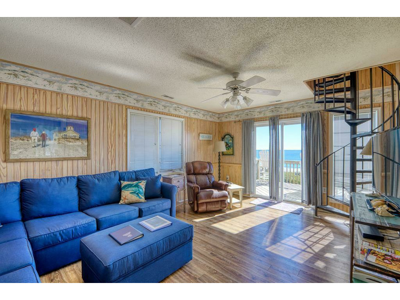 A unique feature of this home is the crow's nest, accessed via a spiral staircase in the oceanfront great room. This cozy perch offers panoramic views of the Atlantic, perfect for reading or quiet conversation.