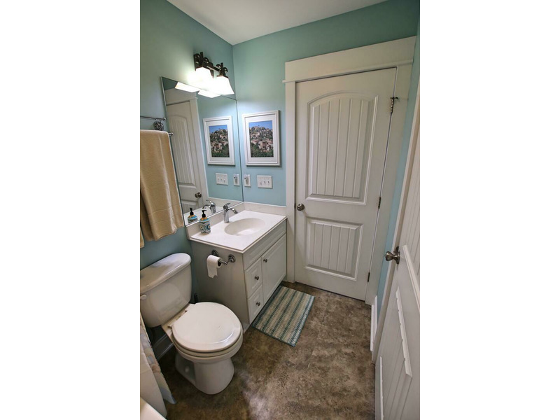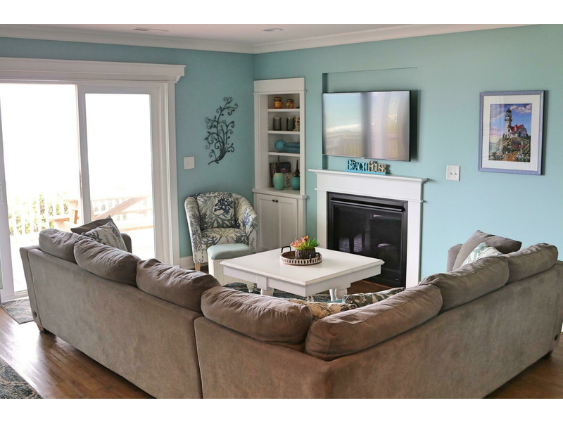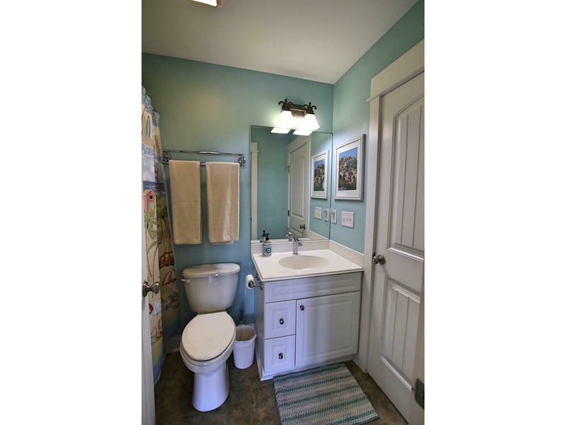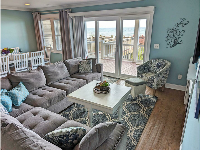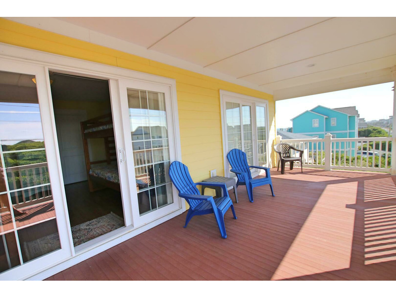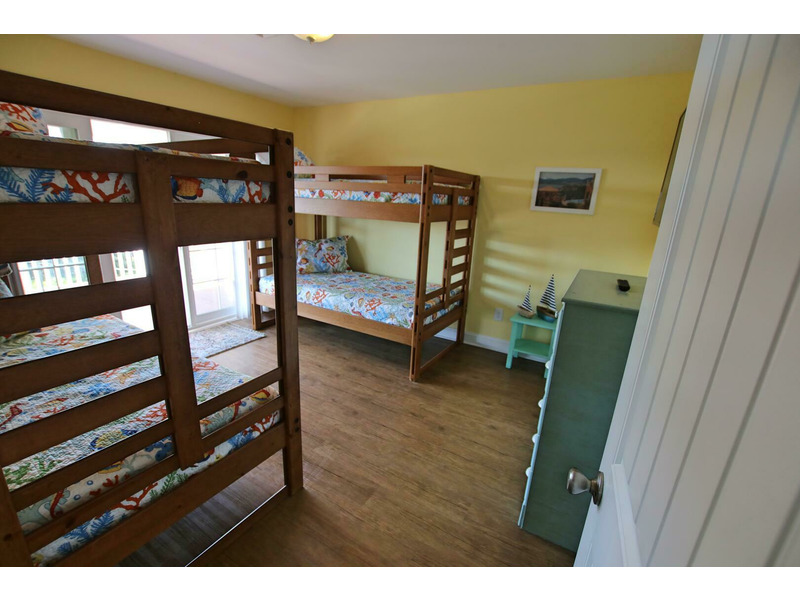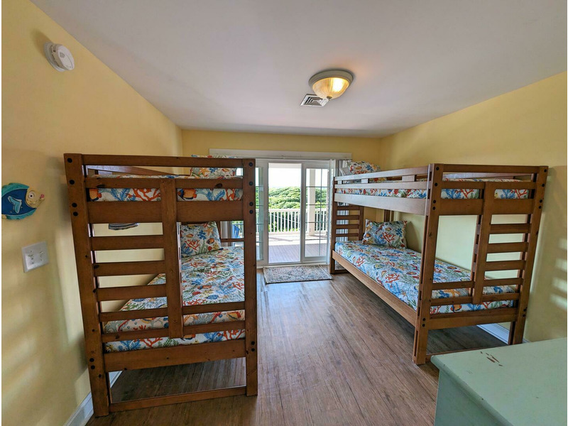 Upstairs, you'll find three additional bedrooms and a sitting area with ocean views and deck access. The oceanfront bedroom offers a king-size bed with a new mattress, a private bath, and direct access to the upper deck. The bunk room features two bunk beds with new mattresses, a Jack-and-Jill bathroom, and access to the street-side covered deck. The final bedroom includes two twin beds with new mattresses, a private bath with an extra vanity and sink, and access to the street-side upper deck.