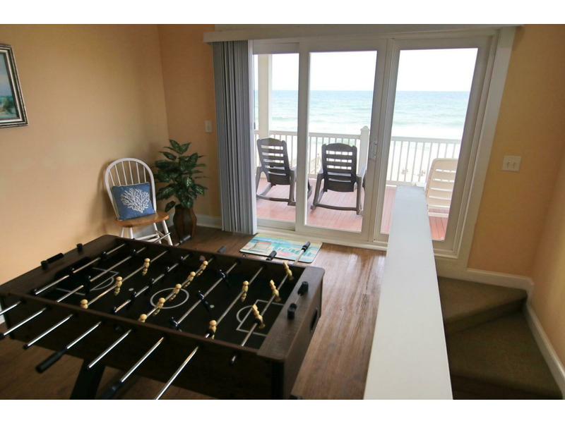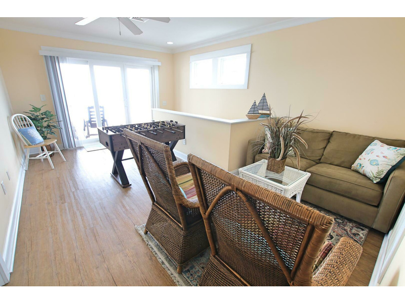 The upstairs sitting area is perfect for relaxing or entertaining, complete with a loveseat, a full-size sleeper sofa, and a foosball table for added fun.