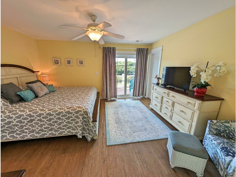 The first bedroom on this level includes a king-size bed with a new mattress, a private bath, and access to a covered deck on the street side of the property.