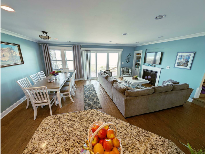 Step into an open-concept living space where the kitchen, dining, and living areas flow seamlessly together. The living room features a large flat-screen TV, a cozy fireplace, and breathtaking ocean views. The fully equipped kitchen boasts new stainless steel appliances, including a brand-new stove, plus granite countertops for a touch of elegance. A separate laundry room houses a full-sized washer and dryer for your convenience.