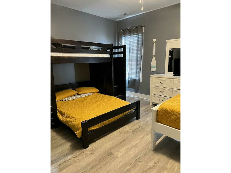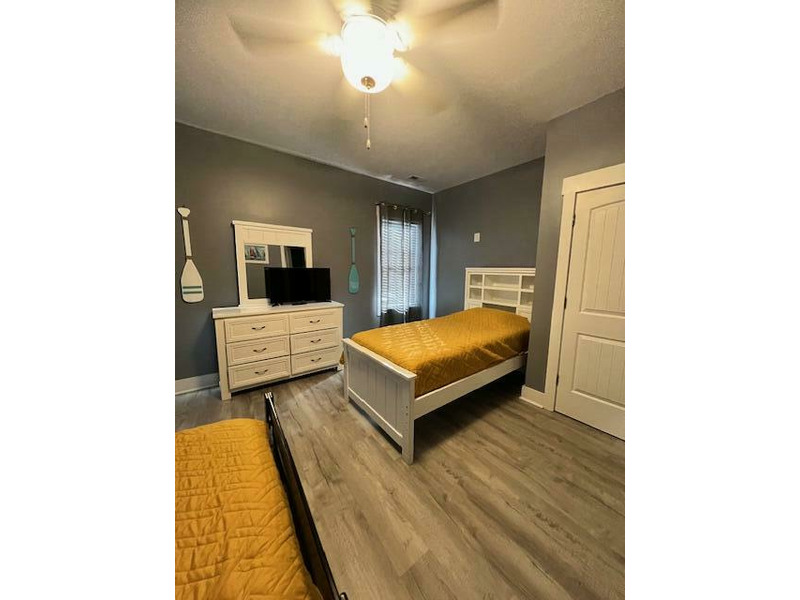 Street-Side Bedroom: Queen bed + double bed with twin trundle, TV, shares hall bath with tub/shower