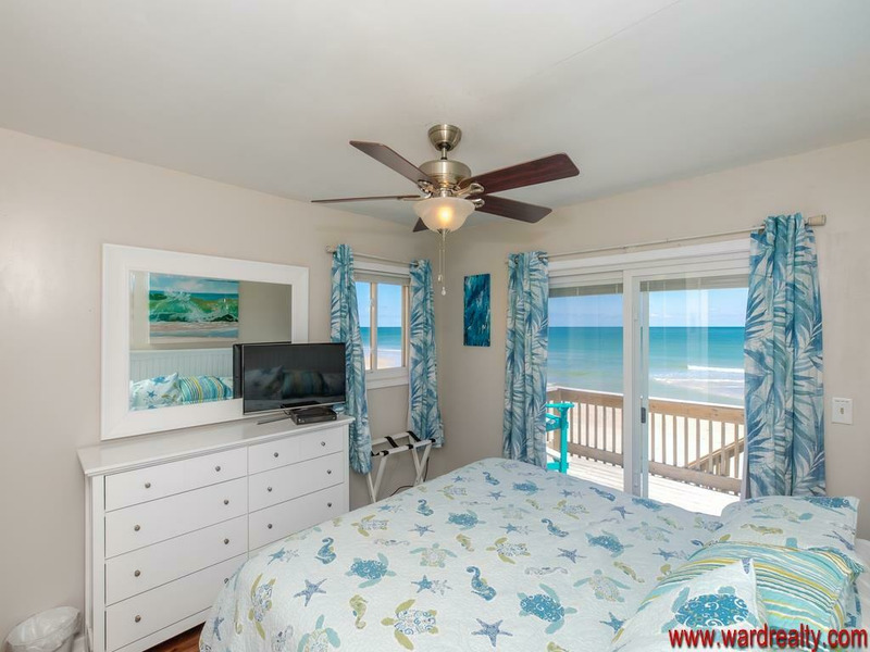 - 1st Floor North Oceanfront Bedroom: Queen Bed; TV; direct access to sun deck; shares hall bathroom with tub/shower