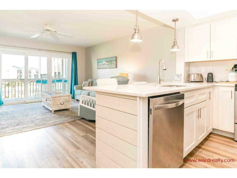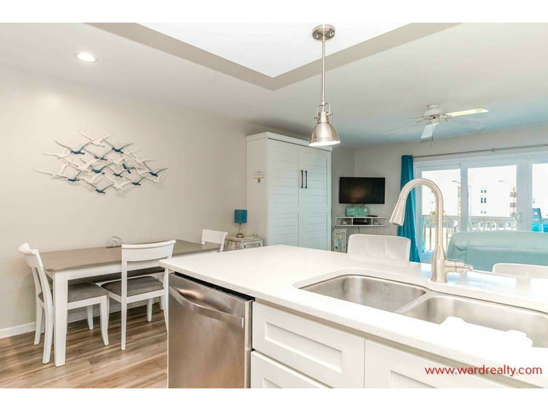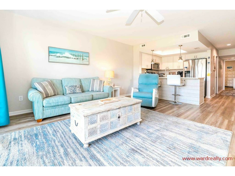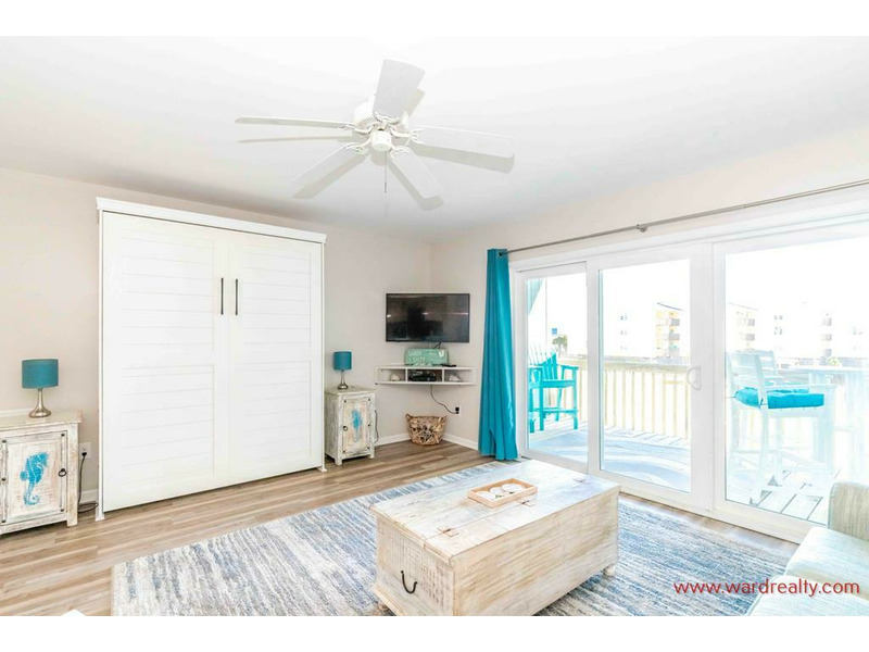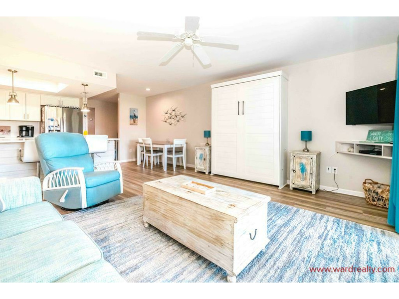 Step inside to the fresh coastal feel in this newly decorated condo. From the driftwood floors to the sea blue walls, and filled with decorator touches, you'll be on beach time in no time! Throw open the drapes to reveal a huge sliding door onto the covered balcony to let in the morning sunshine. You'll find that the efficient kitchen has everything you need to prepare delicious meals. There's room for 4 around the dining table and additional seating at the counter. The living room is bright and comfortable, with a bonus Queen Murphy bed built into one wall for extra sleeping.