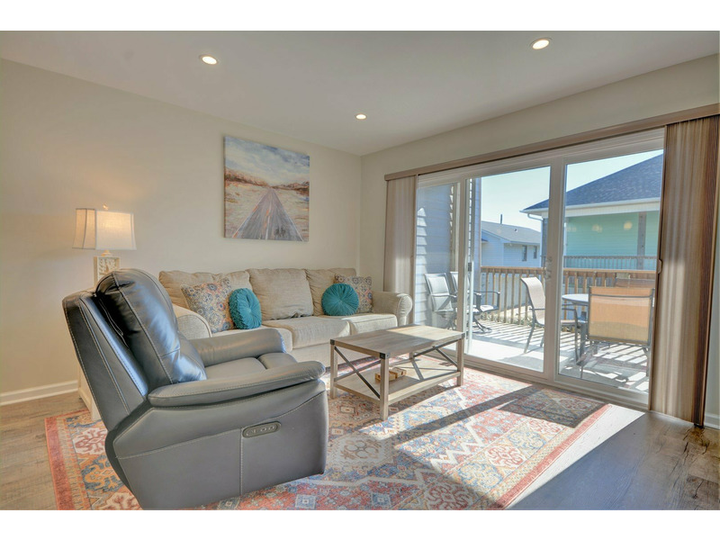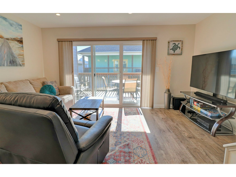 To the right of the kitchen, you’ll find a dining table for 6 and a cozy living area featuring a large flat screen TV. The large sliding glass door lets in ample natural sunlight and leads out to a deck featuring an outdoor dining table, making it the perfect place to enjoy a cup of coffee in the morning.