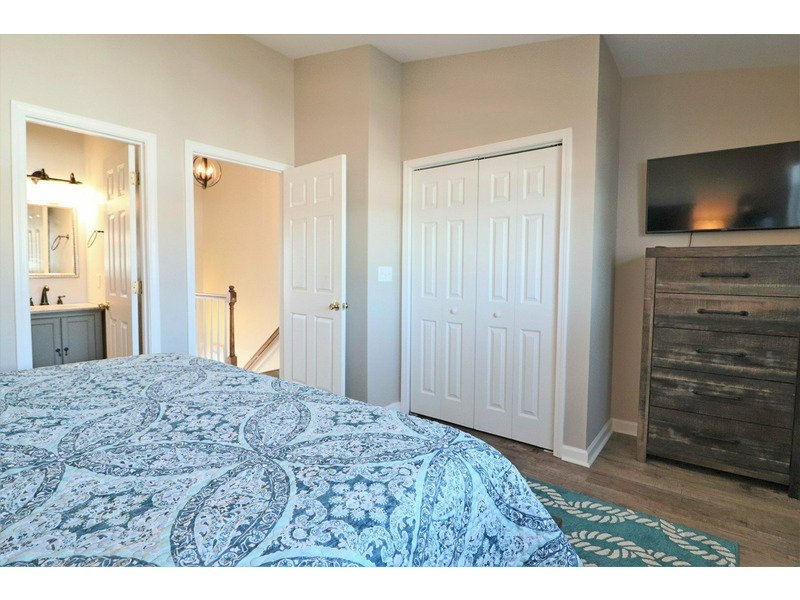 To your left, you will find a laundry closet equipped with a washer and dryer and a bedroom with two bunkbeds. The bedroom uses the full bathroom located in the hallway.