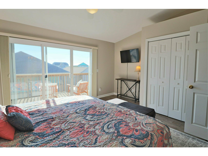 Upstairs, you’ll find two master bedrooms. The first master bedroom features a king bed, TV, en-suite master bathroom, and sound views. The other master bedroom located at the other end of the hallway features a king bed, TV, en-suite master bathroom, and sliding glass doors that lead out to private balcony with seating.