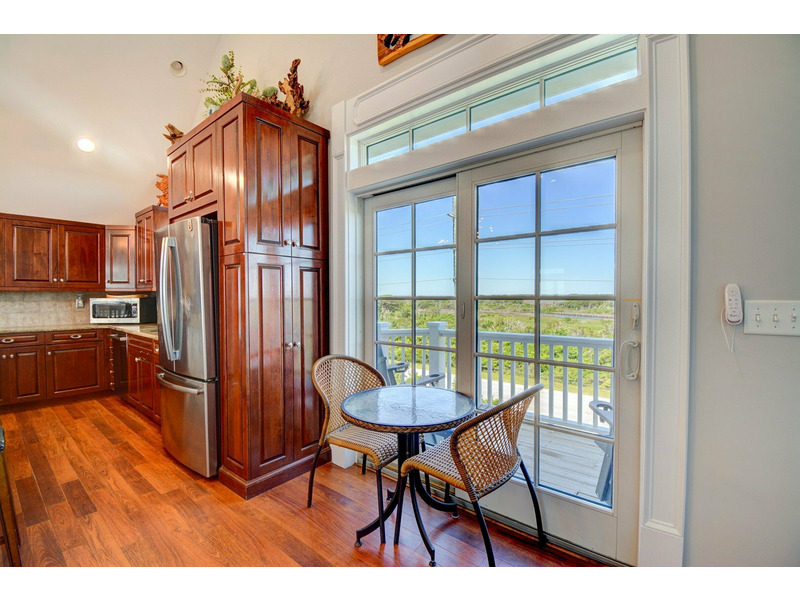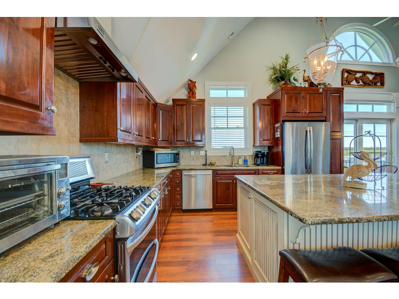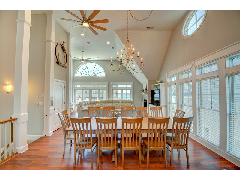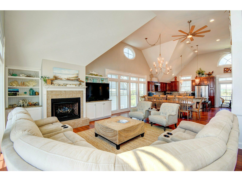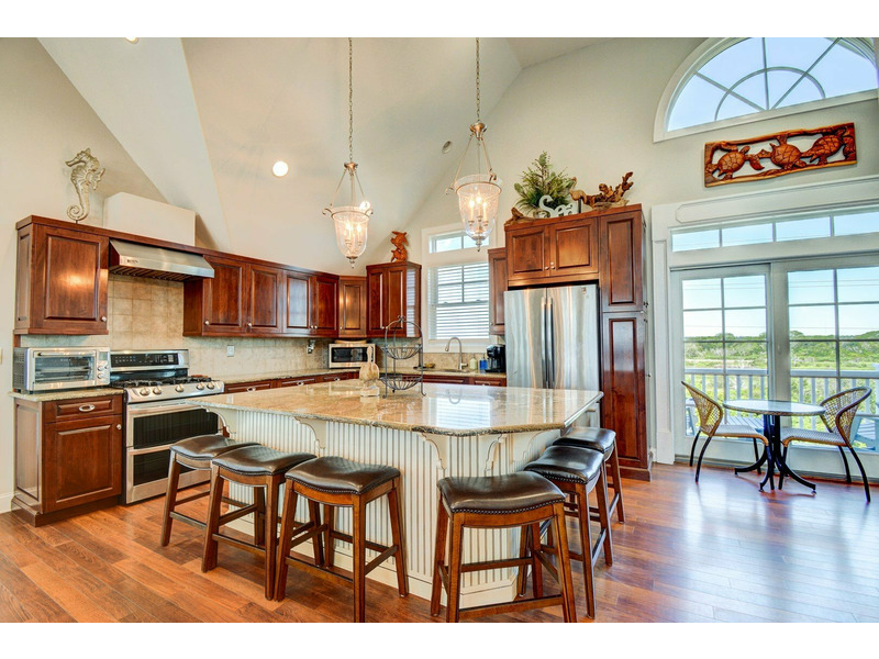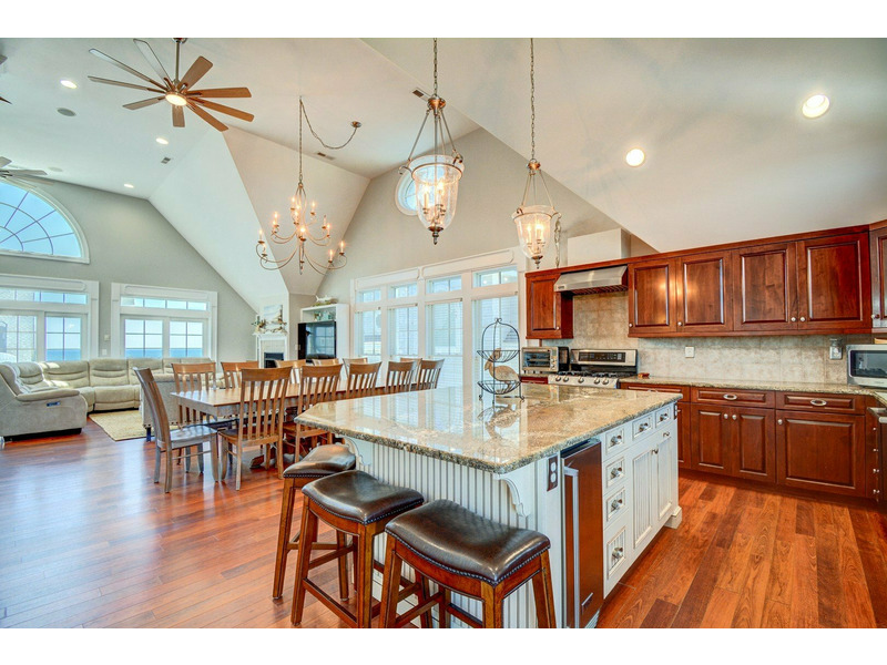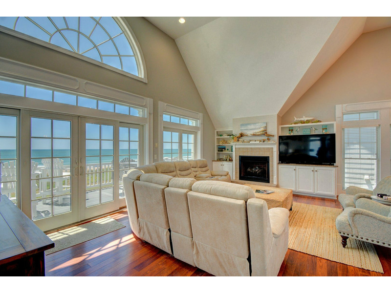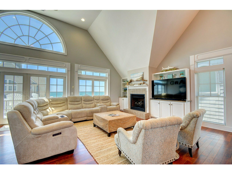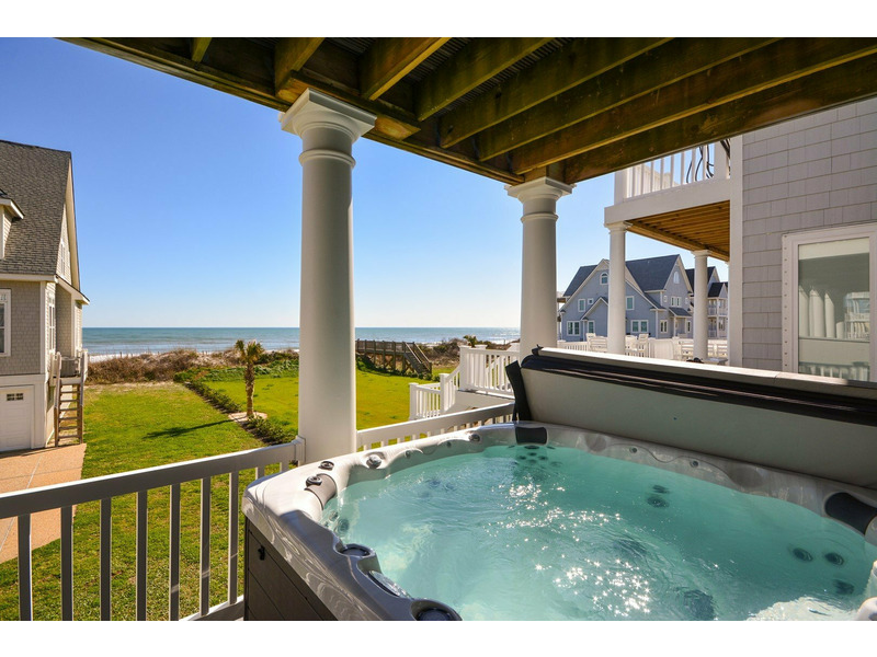 Continue up to the first floor where you’ll find 4 bedrooms, a media room, and a laundry closet. The two sound side bedrooms both feature two sets of twin bunkbeds and a twin with trundle and a television. The media room is equipped with a television, gaming consoles and games, and a wet bar with a mini fridge. The oceanside bedroom to the left features a king bed, handicapped accessible bathroom, television, and deck access. The bedroom to the right features a king bed, large television, and bathroom. On the oceanside bottom deck you’ll find the hot tub, perfect for unwinding in the evening.