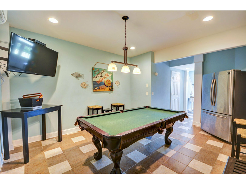 On the ground floor, you will find a private enclosed, hot and cold-water outdoor shower, storage area for beach chairs and toys, and covered parking in the garages. Head inside and past the elevator you will find a pool table lounge featuring a refrigerator and television.