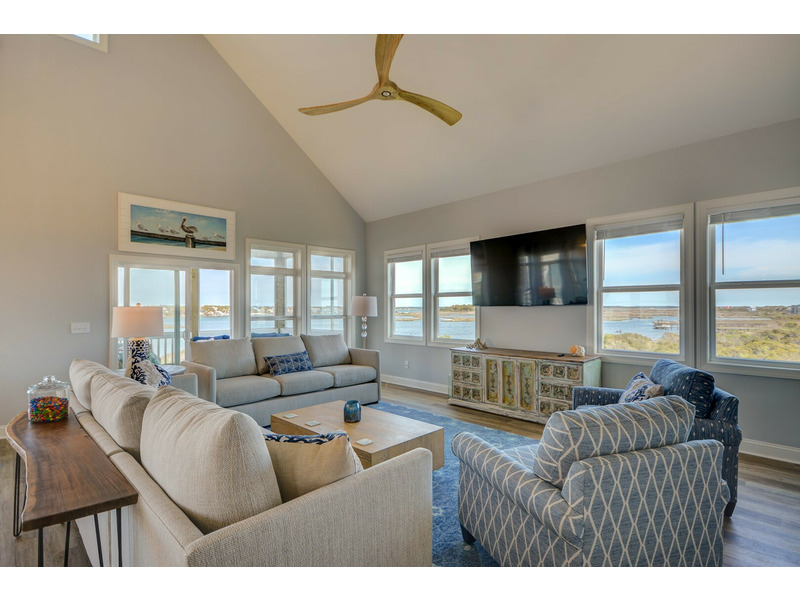 The deck and screened-in porch are oversized to maximize the outdoor experience and beautiful waterway views. The screened in porch provides a comfortable retreat for an afternoon island nap, to share a cocktail and enjoy the island breeze or a late night chat with friends and family. The ICW and sunset views from this level are beautiful!