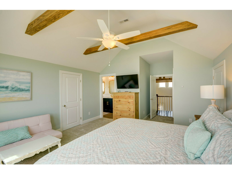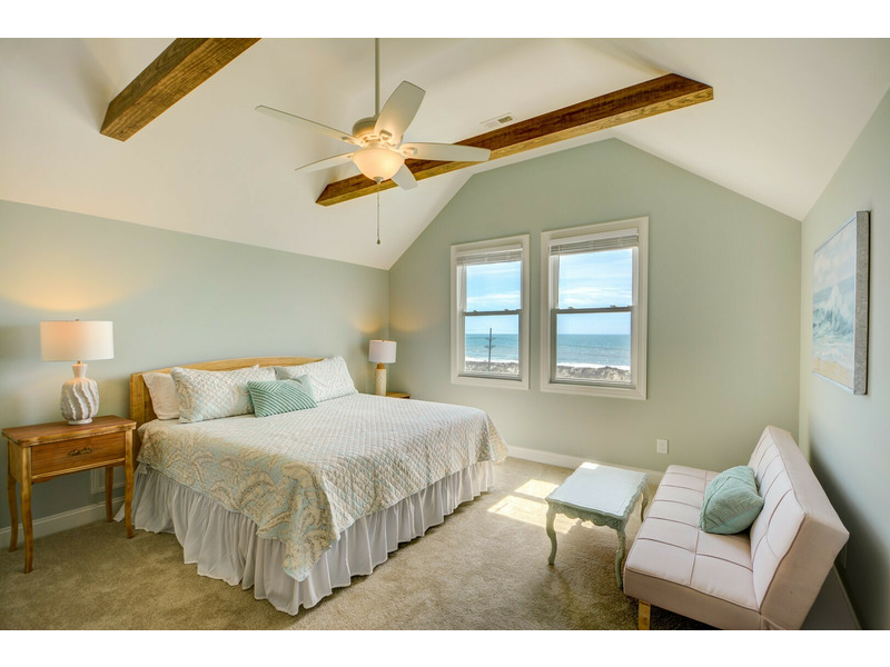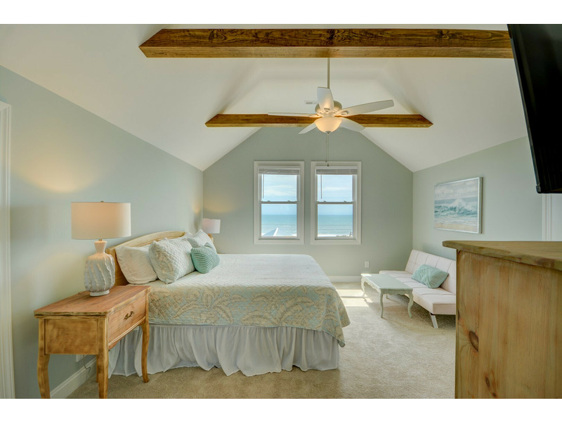 On the third level at the top of the stairs are the sixth and seventh bedrooms. The Sixth bedroom is a Master Suite with a King bed and private bath. Across the hall the Seventh bedroom is perfect for younger guests with three large built-in bunk beds. There is a Twin over Double and two Twin over Queen beds that can sleep up to 9. Two quaint oceanfront decks on both levels provide the perfect spot to relax or watch the waves or to take in a stunning sunrise over the ocean.