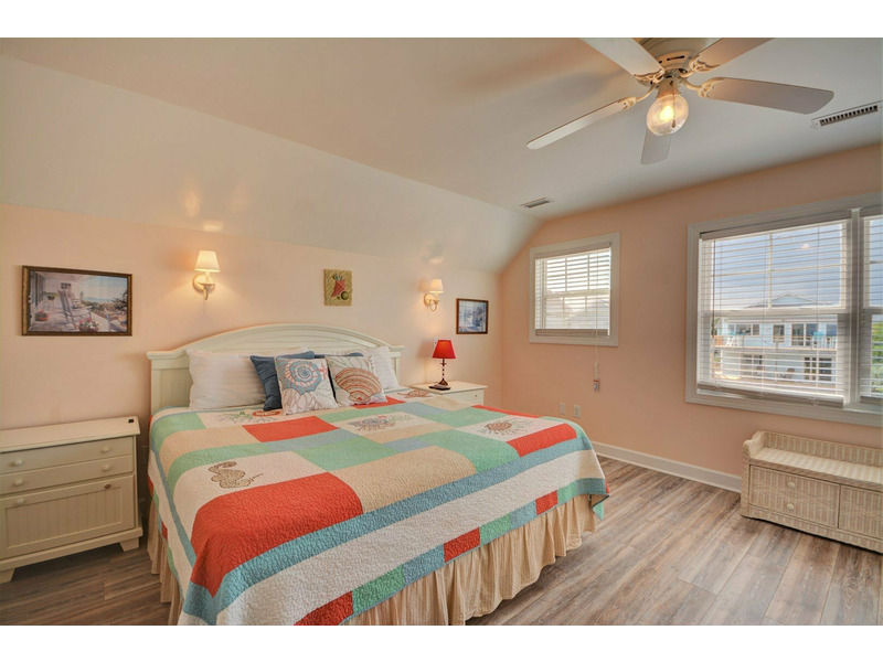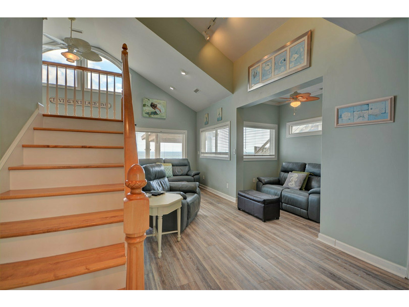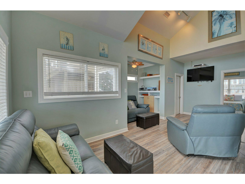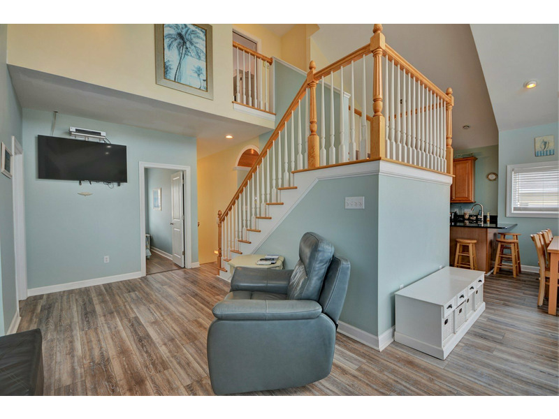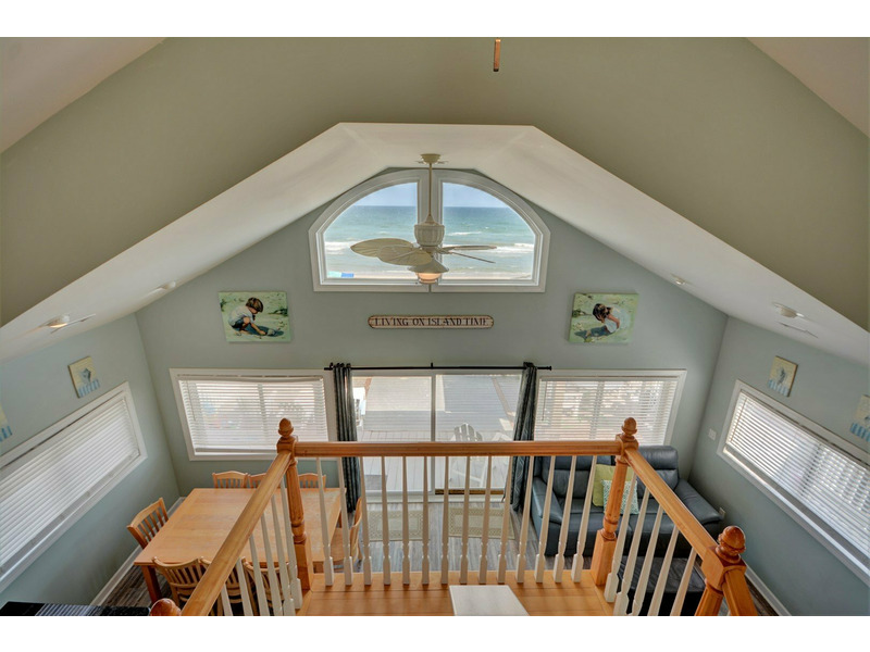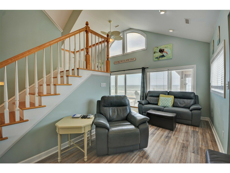 Travel up the staircase to the first level where you will find the main living area, kitchen, dining area, half bath and two additional bedrooms. The dining area and living room are located strategically on the oceanfront side as to take full advantage of the sunny ocean views while relaxing on the couch or eating a hearty meal. Bedrooms three and four are located to the streetside of the home, each with their own private bath. One bedroom offers a reading nook area that is open to the stairwell to the ground floor.