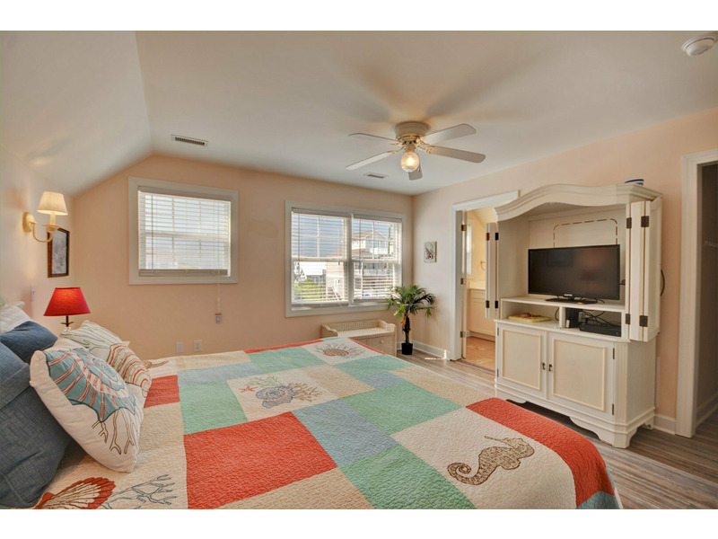 "Mo and Anita's" provides a large master suite located in the upper loft area overlooking the lower living space and taking full advantage of the ocean views from the wall of windows. A relaxing space offering a king bed, this master also contains a full private bathroom and walk-in closet, giving you plenty of room for your wardrobe essentials.