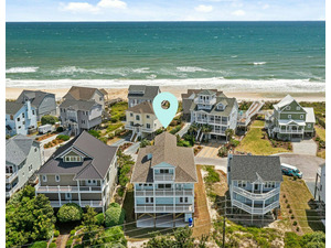 The first-floor master suite offers a king bed, deck access, and a spa-like ensuite bathroom with a walk-in shower, soaking tub, and double vanity. Additional covered deck spaces on each floor provide the perfect spot to enjoy ocean breezes and scenic views.