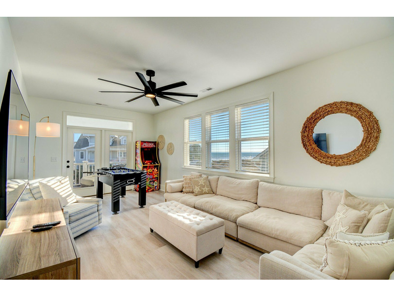 The rec room is designed for fun and relaxation, with a large sectional couch, wall-mounted TV, foosball table, and a new video arcade machine featuring 60 games, ideal for guests of all ages.