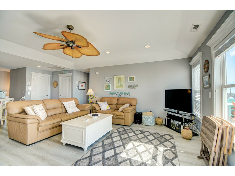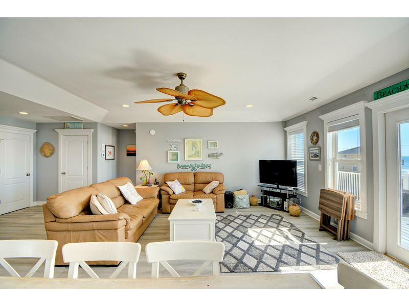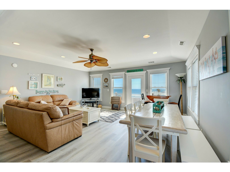 Straight ahead of the kitchen is a large farm dining table providing seating for ten. In the corner of the dining area is a small pub-height table with an ocean view, perfect for enjoying your morning coffee. The living room has two large leather couches that face the flat screen TV.