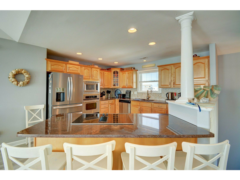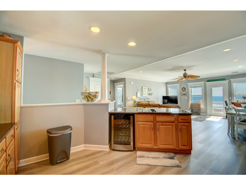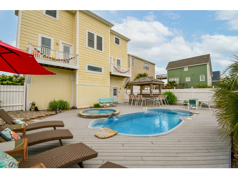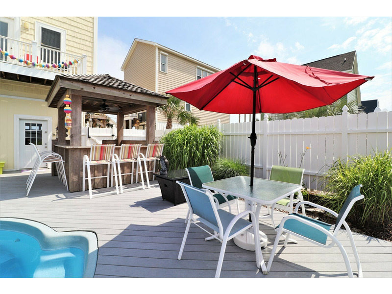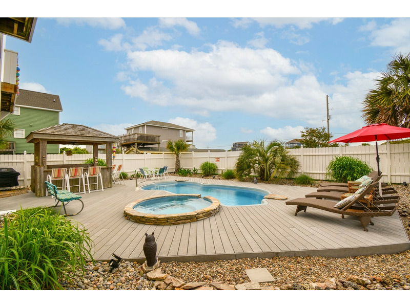 An elevator is located inside the home and runs from the ground floor foyer to the top floor off of the kitchen. A two car attached garage allows access to the backyards private in ground pool. A tiki bar sits in the corner with granite counters and a sink, perfect for blending up a frozen concoction for sipping by the pool. A few beach cruiser bicycles are available to allow guests to explore more of the beauty of Topsail Island.