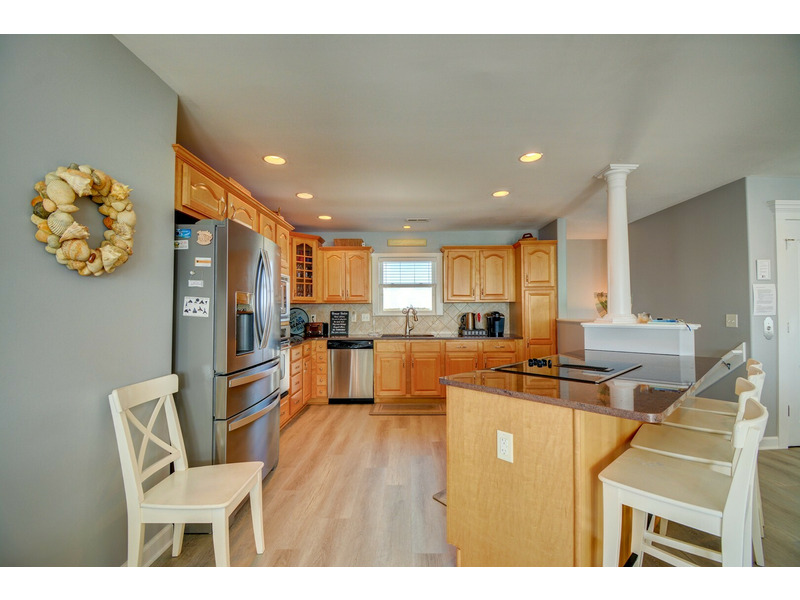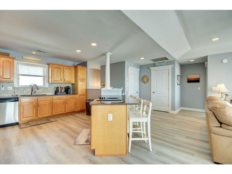 Upstairs guests will find the gorgeous main level. To the right, a cook's dream gourmet kitchen is found offering granite counters, stainless appliances and an island with a flat stove top, wine cooler and bar seating. A Keurig coffee maker and electric tea kettle are also provided for your convenience!