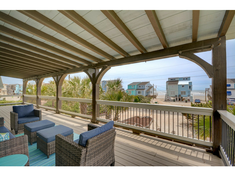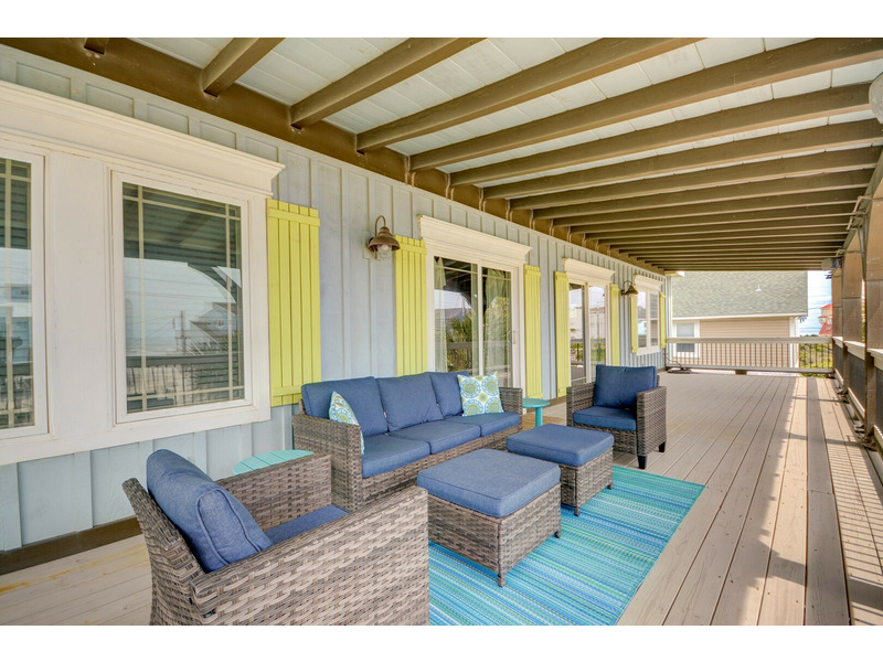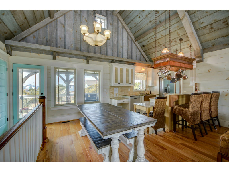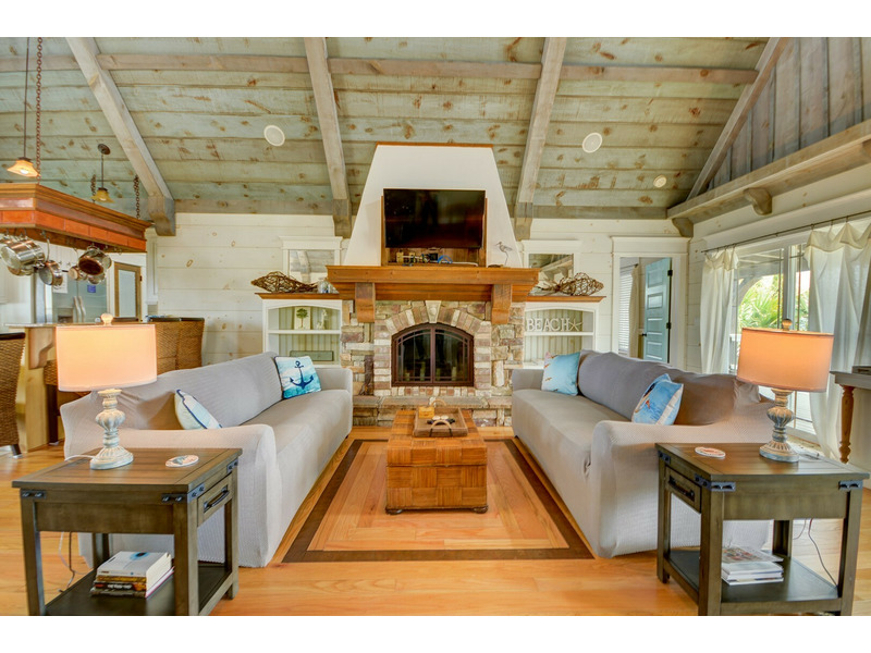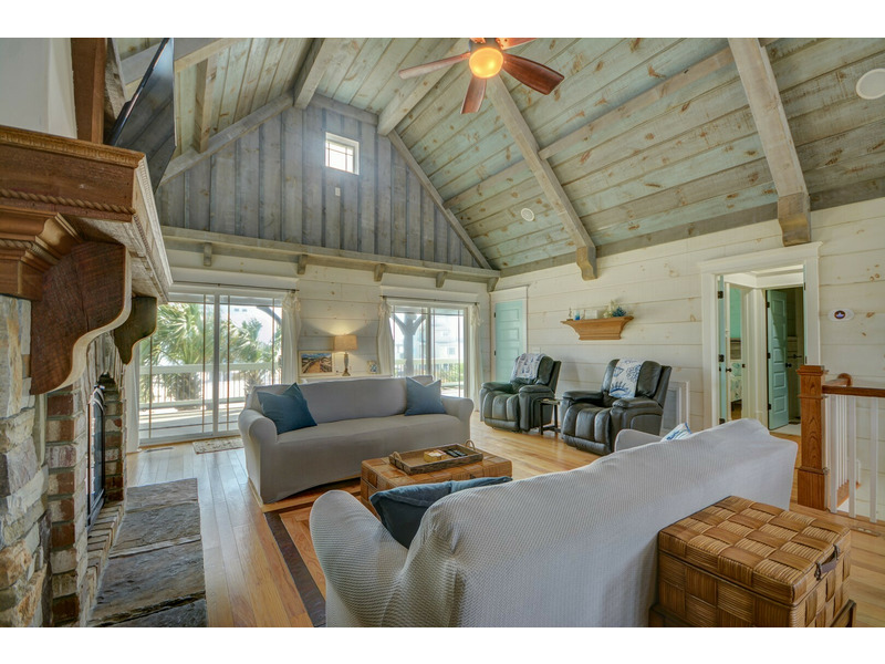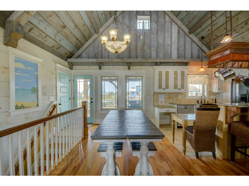 Welcome to The Seaside Craftsman, undoubtedly one of the standout properties on Topsail Island! With its unique features such as shiplap walls and ceilings, rustic hardware, a charming stone fireplace (decorative only), a spacious copper tub, and built-in bunk beds, this home showcases a uniquely luxurious craftsman style and reflects a relaxed, coastal feel. Plus, modern conveniences like double showerheads in the master en suite and a tankless whole-house water heater ensure your comfort.