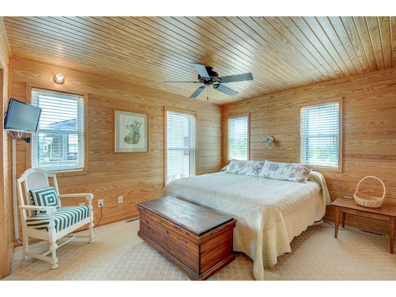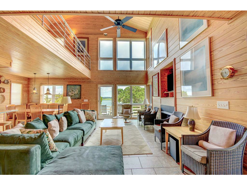 This architect-designed soundfront home offers a serene setting with stunning views, a screened porch with rocking chairs, and a shared dock (with Ellington RRR). The nautical-inspired design includes warm wooden interiors, a cozy library, and a charming tower feature.