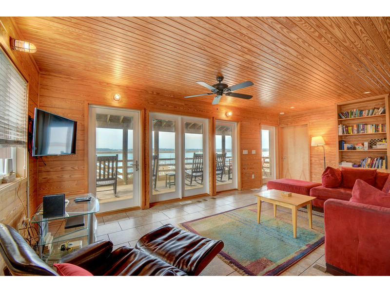 Step inside and feel right at home in the warm, wood-accented living space filled with natural light. The open-concept design features a spacious kitchen and dining area, a built-in bookshelf stocked with vacation reads, and a plush sectional that invites you to kick back and relax. The wall of windows and glass doors draws your gaze straight to the deck and beyond, where rocking chairs overlook the peaceful sound.