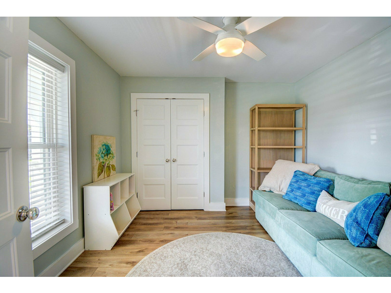 The home sleeps 15 across six bedrooms. On the main floor, you’ll find a streetside king bedroom, two queen bedrooms that share a full bath, and a separate room with a sleeper sofa for flexible sleeping space. Upstairs, the primary king suite offers beautiful water views, a private bath, a dedicated desk area, and its own private deck overlooking the canal — perfect for morning coffee or catching up on emails with a view. Also upstairs is a bunk room with a twin-over-twin and twin-over-double bunk, creating a fun retreat for kids and teens.