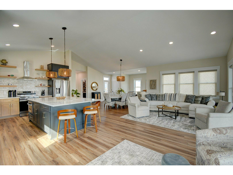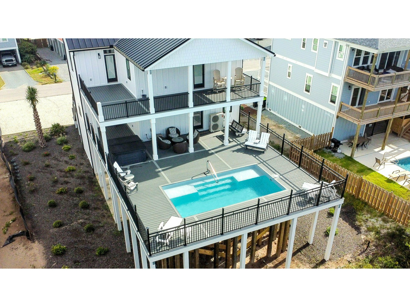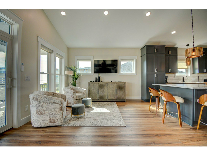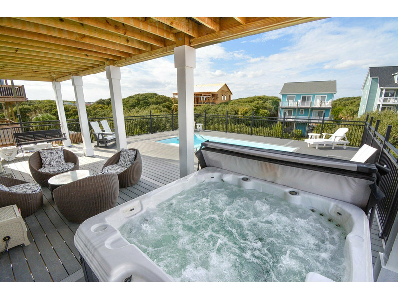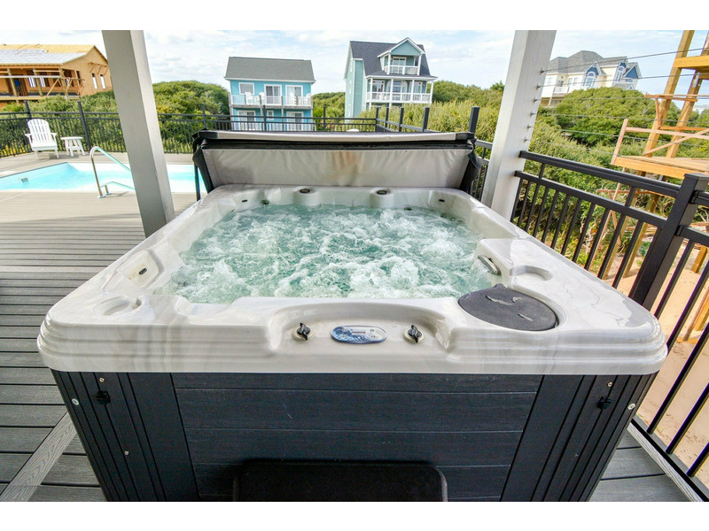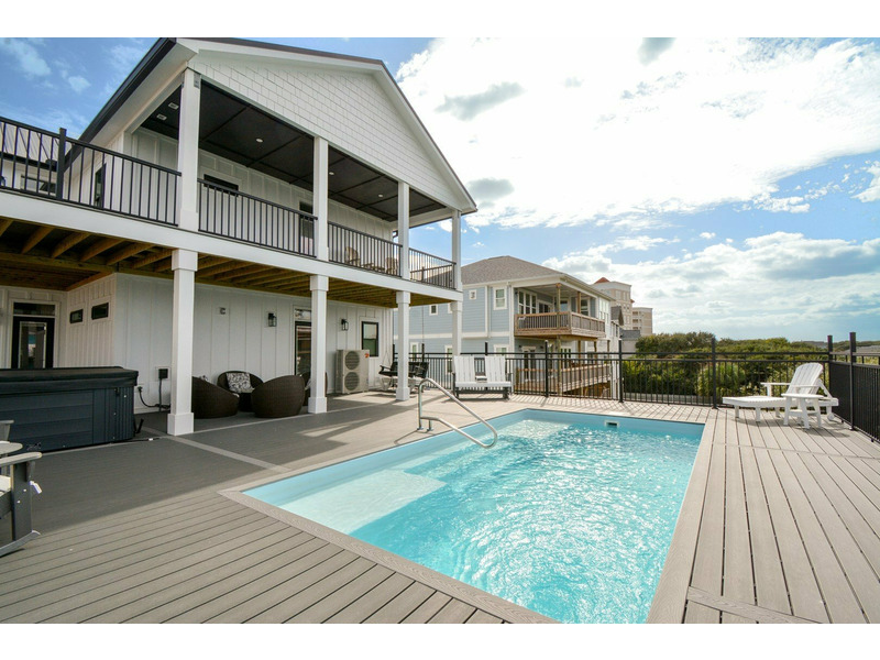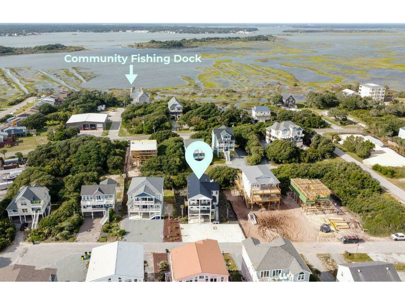 Outdoor living is where Fin & Tonic really shines. The private pool area features plenty of space to lounge in the sun or relax in the shade, along with a hot tub for evening soaks under the stars. For added peace of mind, the doors leading to the pool area are equipped with safety alarms. Multiple decks throughout the home provide peaceful places to enjoy the ocean breeze and coastal surroundings. Located just a short walk from the community beach access, this home makes it easy to spend your days by the ocean. Guests also have access to the community fishing dock on the sound side — perfect for casting a line, watching wildlife, or enjoying a quiet moment over the water.
