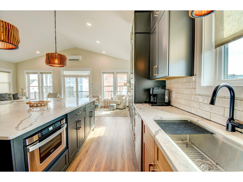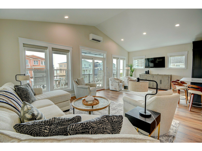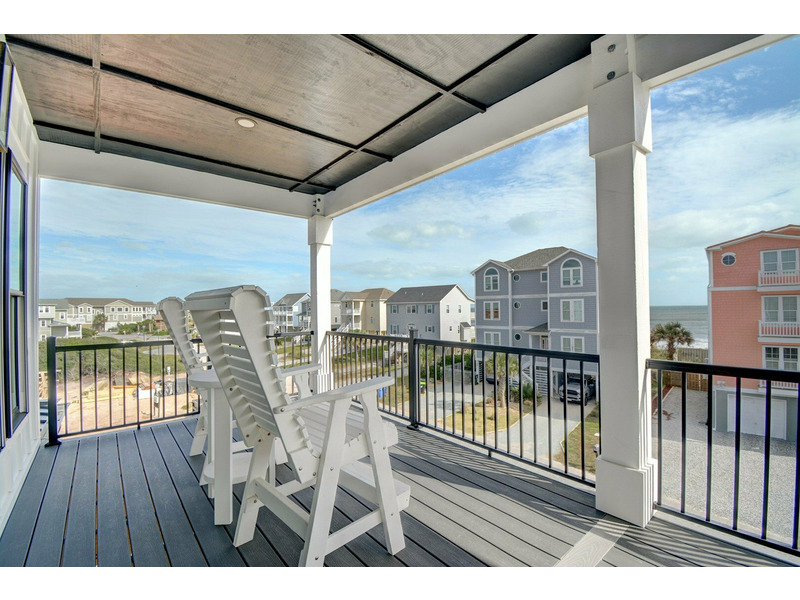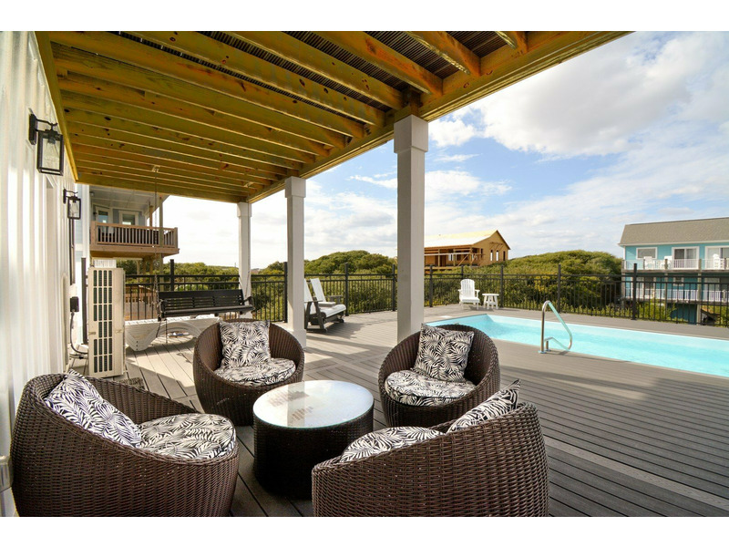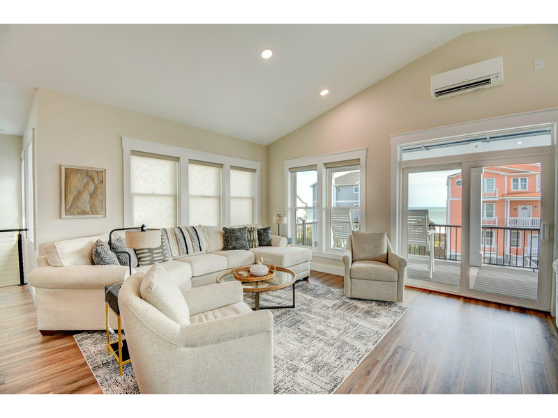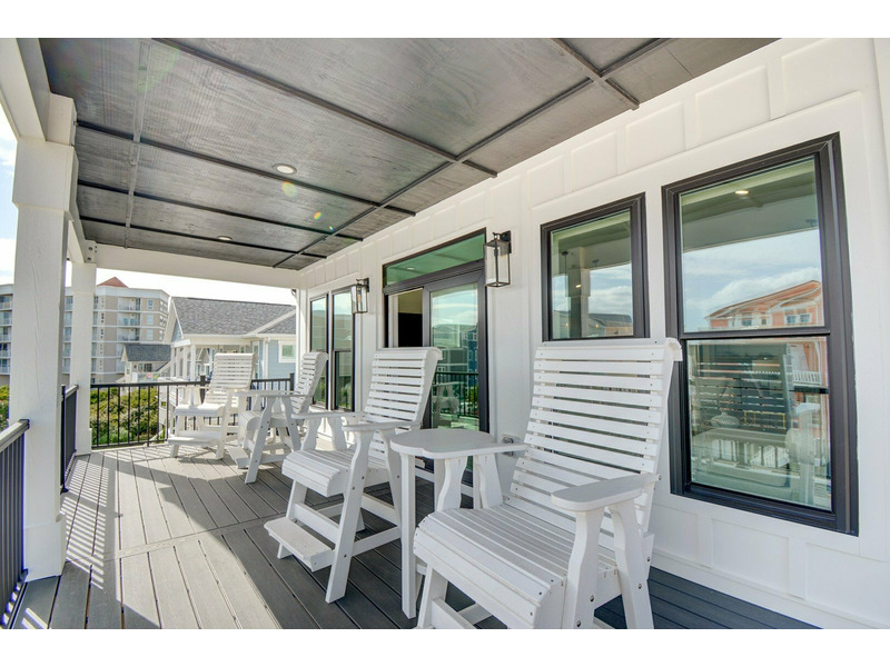Step inside on the first floor, where you’ll find a king bedroom with an en suite bathroom and direct access to the back deck and pool area. Two additional queen bedrooms share a Jack-and-Jill bathroom, and a door in the hallway near these rooms opens to the covered front deck where you can take in the ocean breeze. A laundry room is also located on this level for convenience.