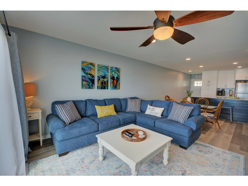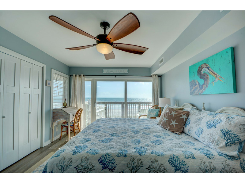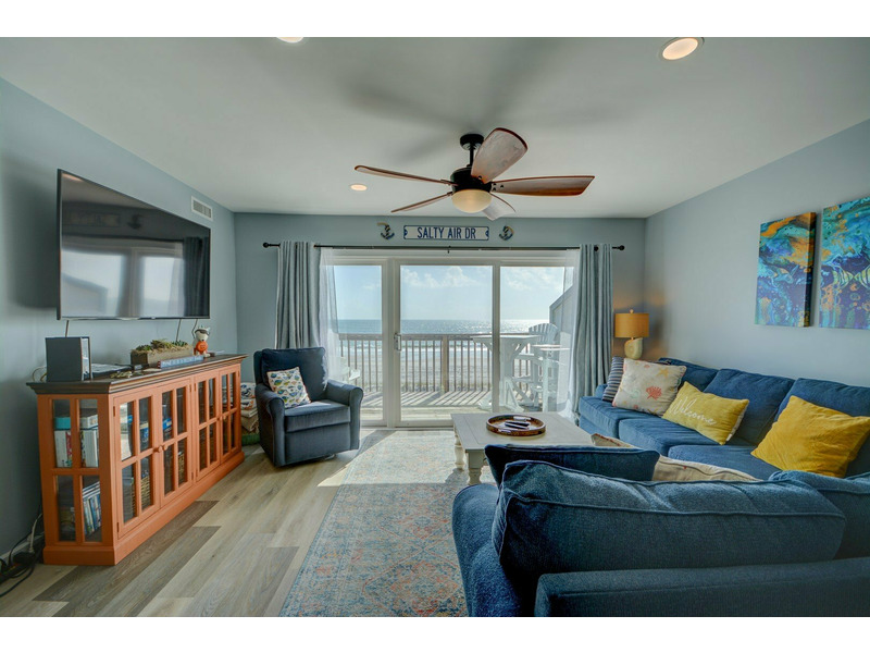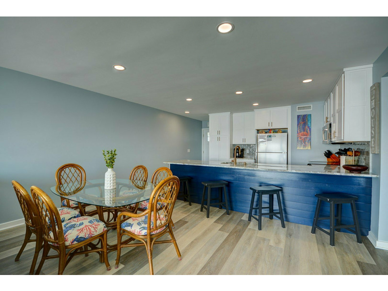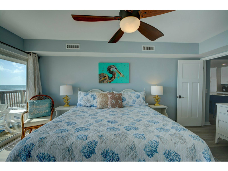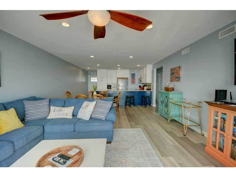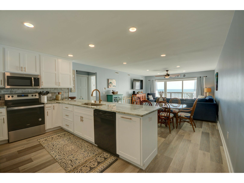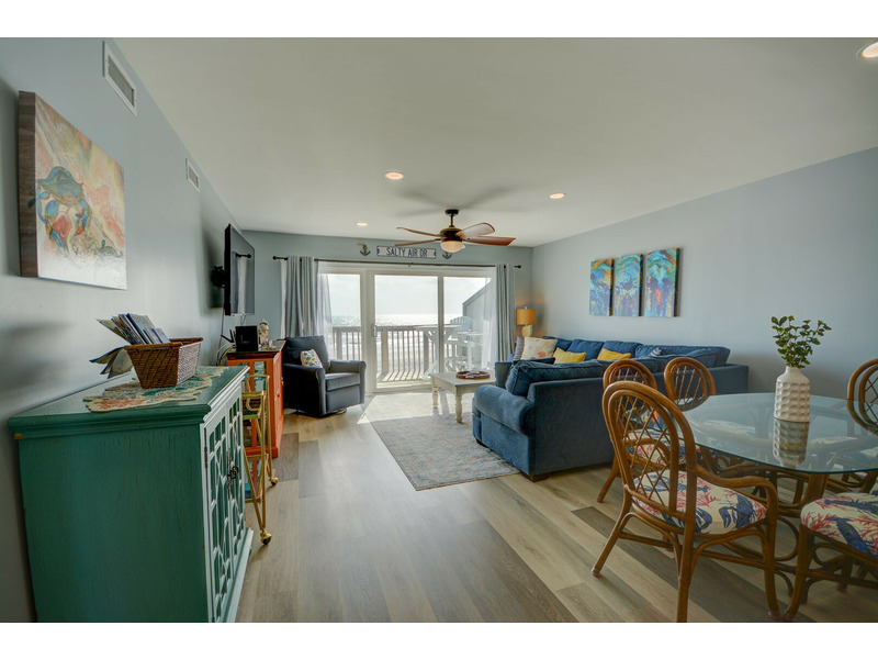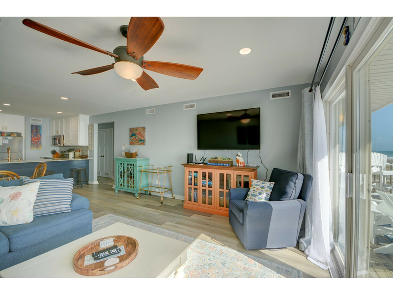 Unit E-217, located on the second floor of the complex, begins your experience with a small coat closet to your left followed by the fully equipped kitchen boasting bar seating for four. As you walk past the kitchen, the condo opens up into the dining area and living room with plenty of seating, a large flat-screen TV. DVD player with videos and sliding glass doors out to the stunning blue vistas from the deck! You can listen to the ocean right from the living room or while sleeping on the queen sleeper sofa, conveniently provided for extra sleeping accommodations.