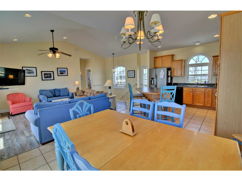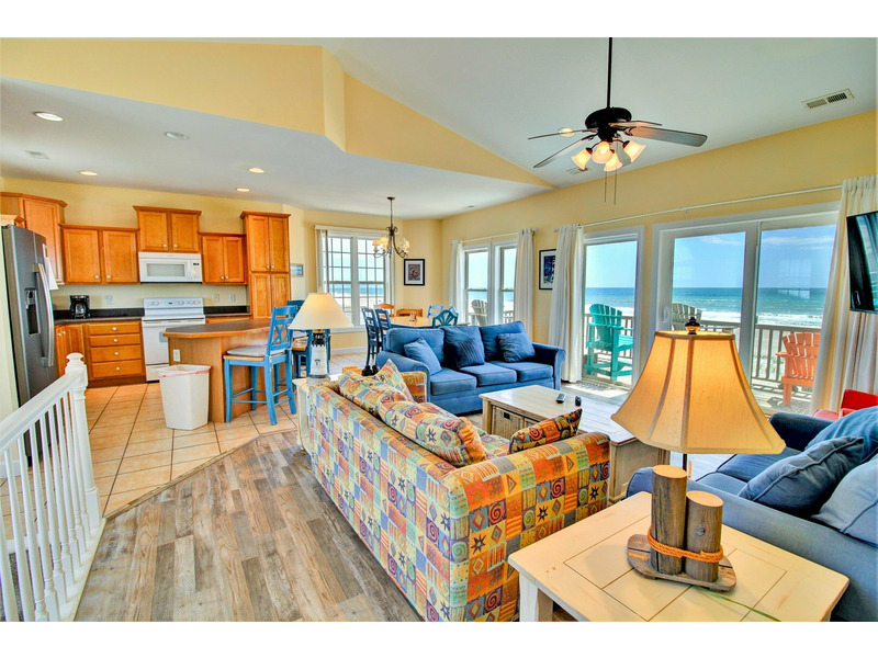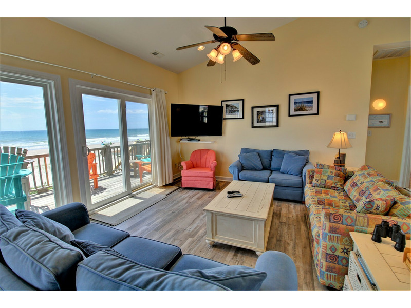Tall, oceanfront windows allow this home to be bathed in natural light as well as provide beautiful views of the ocean from all areas of the upper level. The dining area is strategically found oceanside providing a large dining room table. Three comfortable sofas allow for plenty of seating in the living room and 43-in smart TV is perfect for movie night.