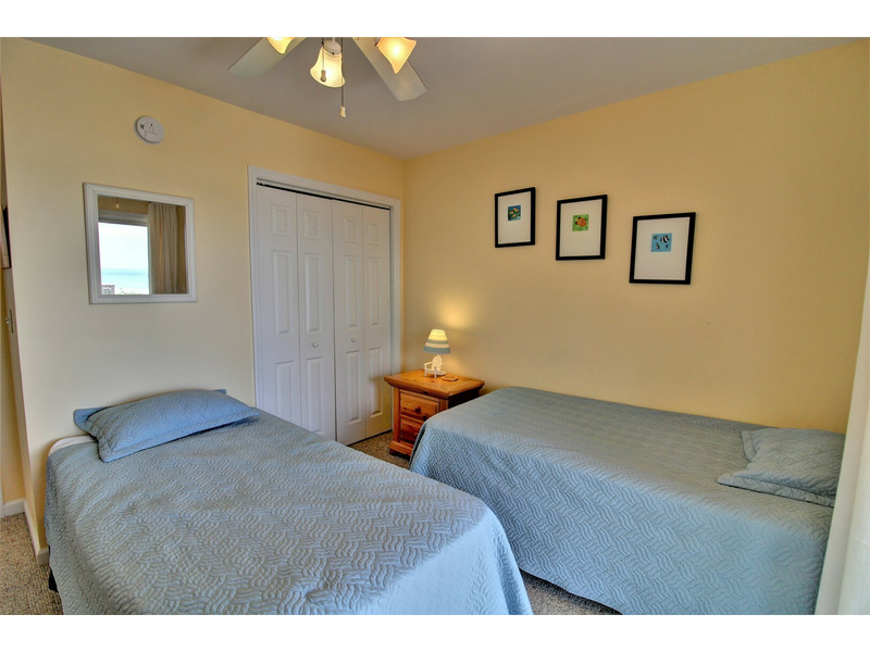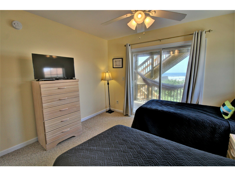 To your right, continuing down the hallway, lies bedroom two featuring two twin beds and access to the oceanfront deck through sliding glass doors. Across the hallway from the bedrooms is a small closet conveniently containing a washer and dryer. Finally, at the end of the hallway is bedroom three, providing a queen bed.