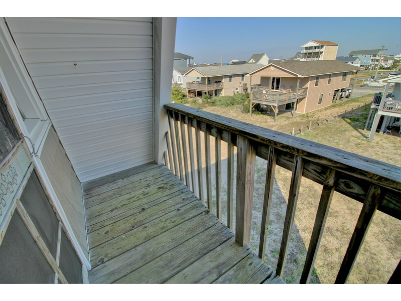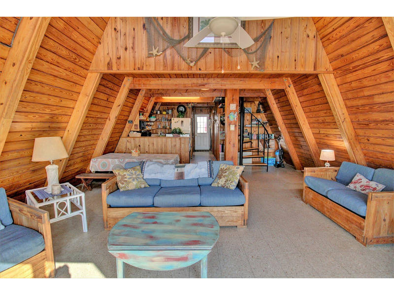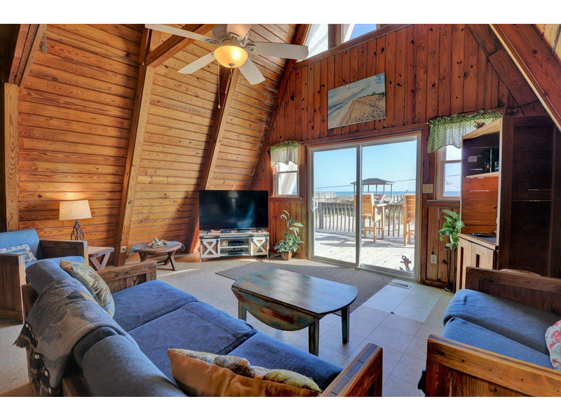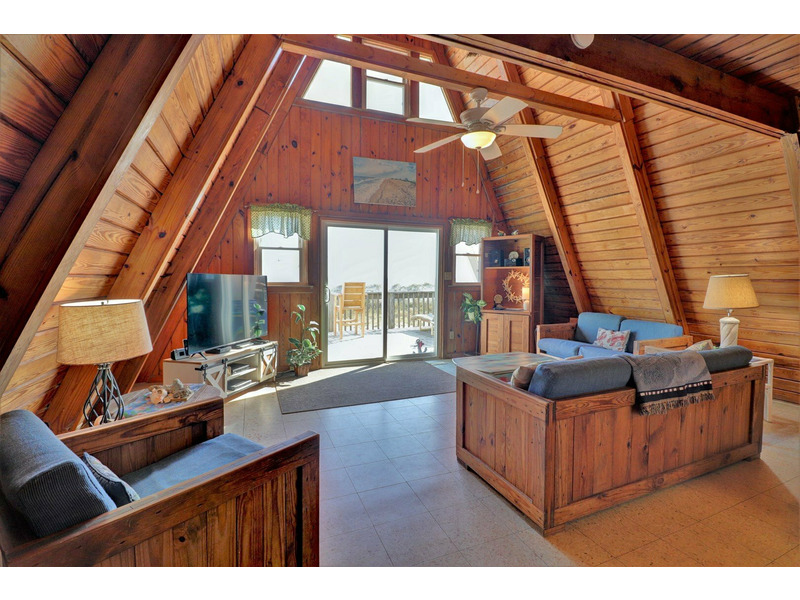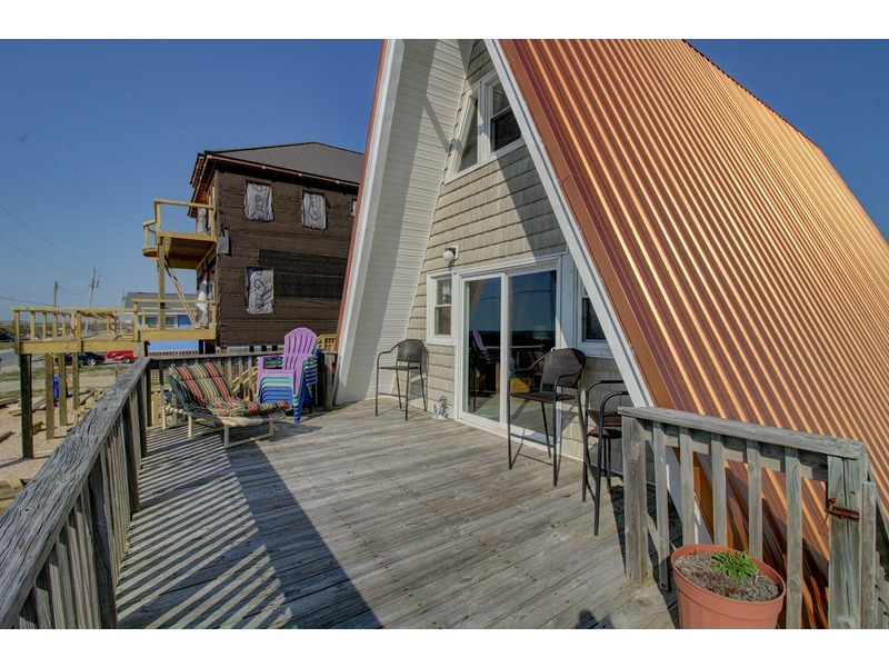 Located close to an oceanfront public beach access, "Copper Top" is a unique 3 bedroom "A-Frame" beach house in Topsail Island. This home watches quietly over the ocean from its large oceanside deck. Entering from the deck brings you into the living room with warm natural wood ceilings and a beach themed decor. The living room is open to a small dining area provided by a rustic wooden picnic table set, located beside the kitchen.