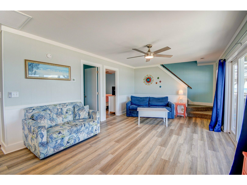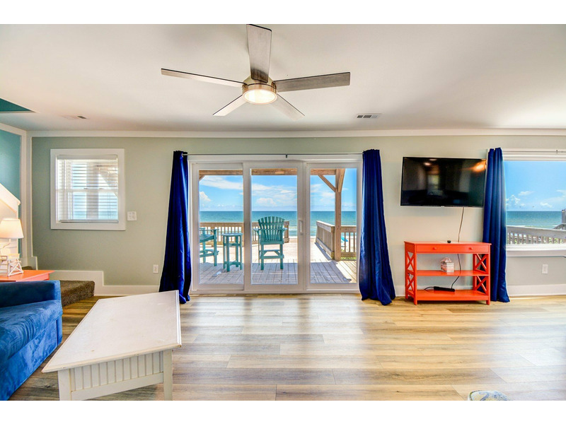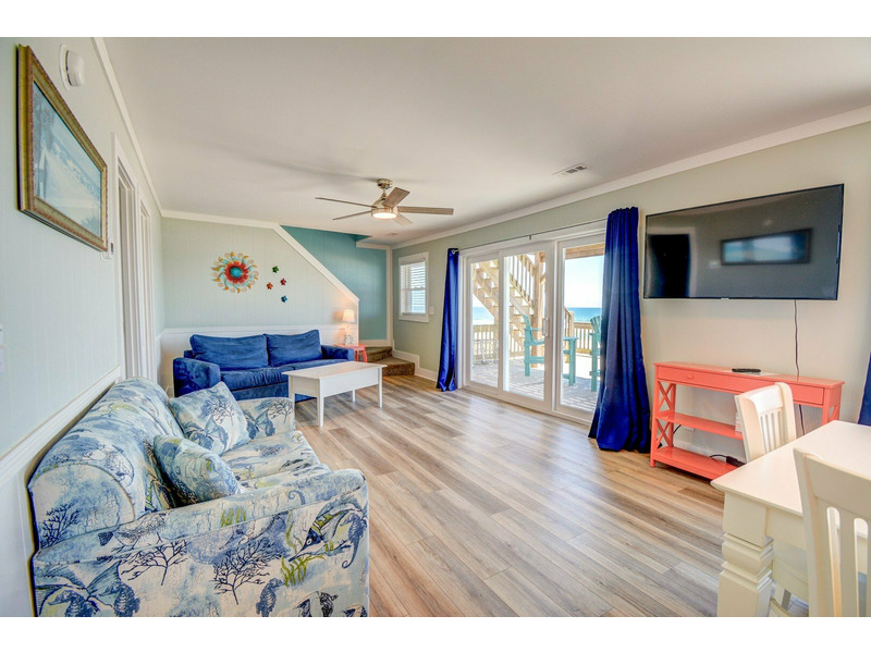 The dining area and kitchen transition into the living room where a large flat screen television and comfortable furniture to relax on can be found. Sliding glass doors provide access to the oceanfront deck where you can bask in the sun or relax in the shade the upper deck provides. Bedroom one sits to the left of the living room and has a private bath/shower, television and queen bed.