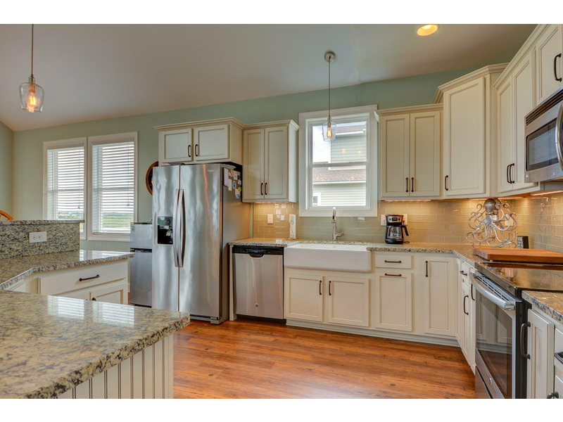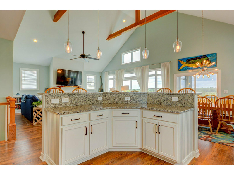 The top floor provides a panoramic view of the ICW to the west and an incredible ocean view to the east. This main living area provides and abundance of sunlight, warmth and openness of the living room, dining room and chef’s kitchen. The living room is a great gathering place for family game night. The dining room is spacious with a table that seats 10 along with additional seating for 6 at the kitchen island. The chef’s kitchen features stainless appliances, a large granite island, farm sink and pantry. On this level, there are two Master suites, one with a king bed and one with a queen. Both suites provide ocean views and private en suite bathrooms.