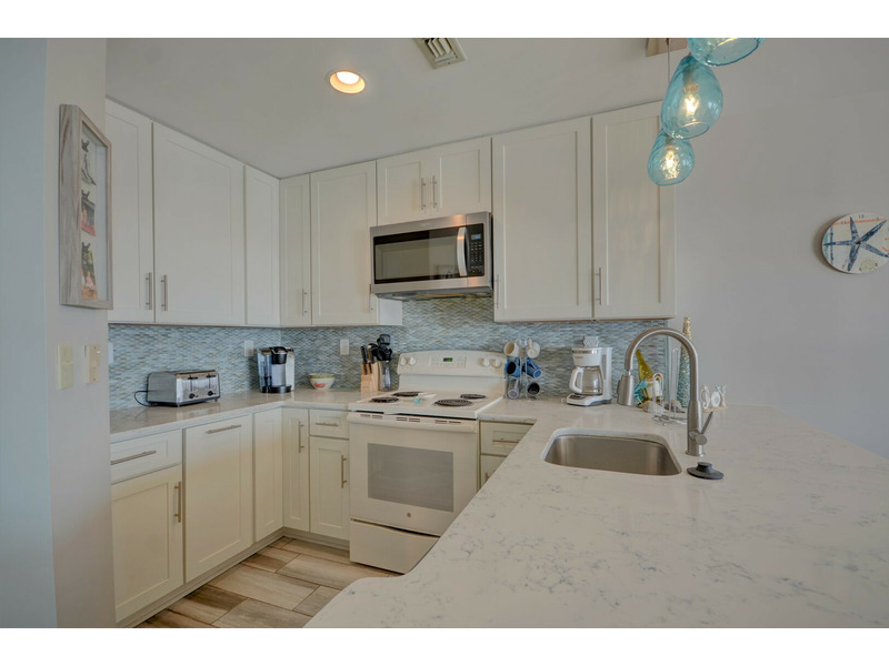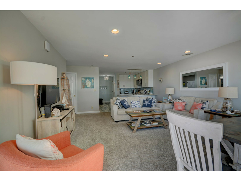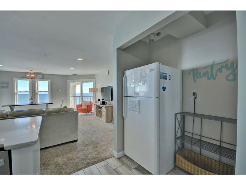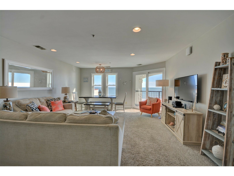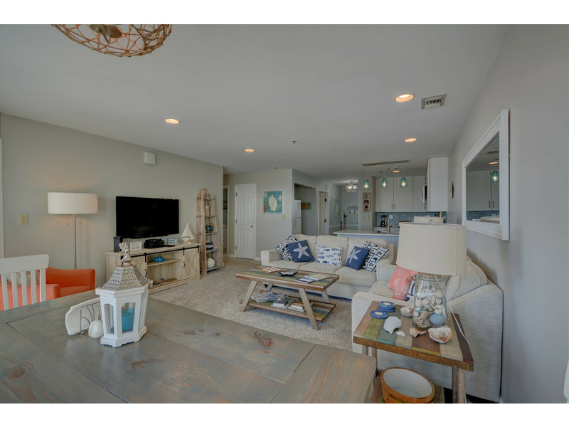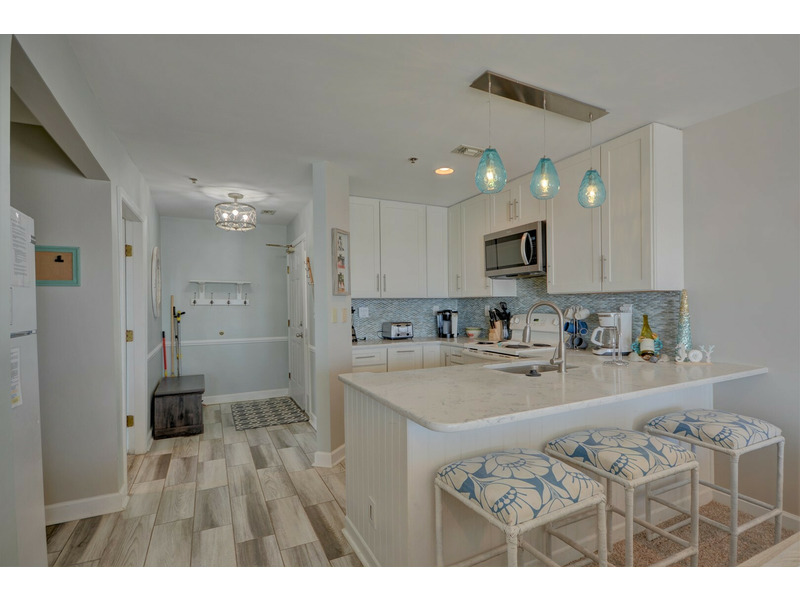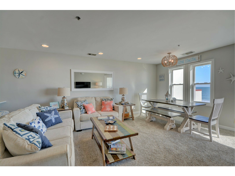 Entering the main living area, the fully equipped updated kitchen with bar seating islocated to your left. (Regular coffee maker and Keurig for coffee connoisseurs) Directly in front of the kitchen is the living and dining areas. The living area has two comfortable couches perfect for lounging while taking in the view from the sliding glass door out to the large ocean front balcony. A flatscreen smart TV sits against the wall, ready for watching a movie in the evening. You will spend most of your time relaxing on the balcony because the view isamazing. The dining area has a large farm style table overlooking the ocean, the perfect spot for side splitting laughter from gathered family.