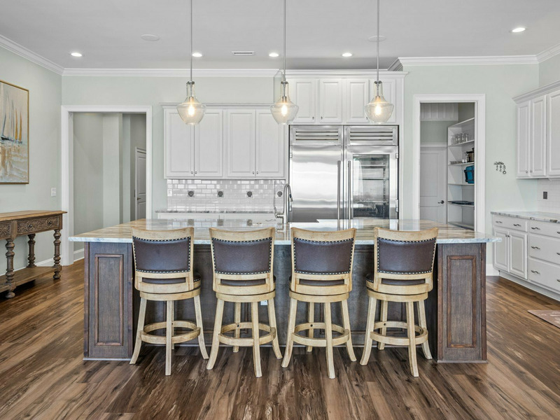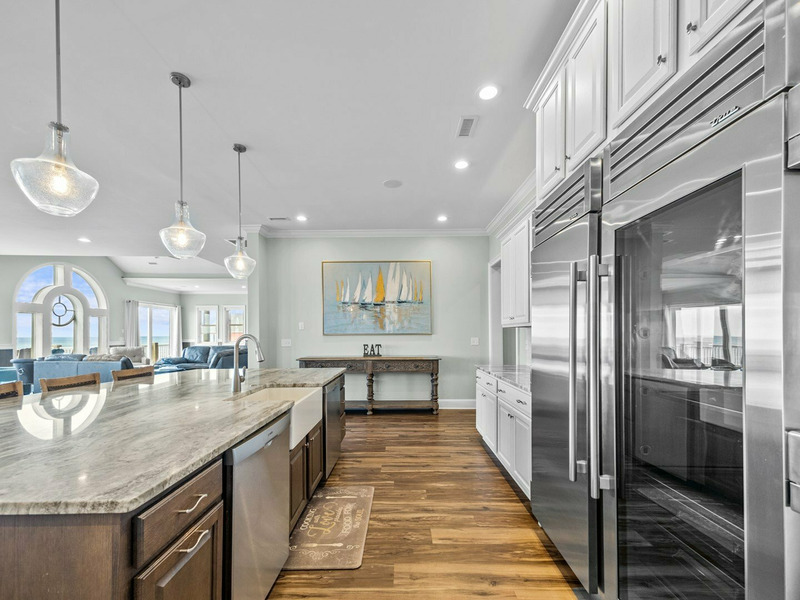 To the left of the living area, you will find an oceanfront Queen suite and an interior King suite, both with private full sized bathrooms. Continue down the hall and find a secondary laundry room with a stackable washer and dryer – conveniently located to avoid carrying loads of laundry up or down floors! At the end of the hallway, you will find the Bunk Bed Suite – perfect for the kids! This suite features three custom-built twin bunks, one with a trundle bed (a total of seven twin beds) and a bathroom with separate water closet for privacy.