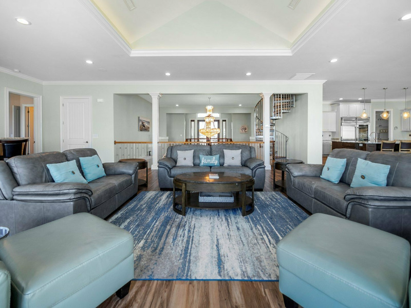 To the right of the living area, a master suite invites you in with a King and Queen bed, spacious bathroom with shower and jetted tub, and access to the Oceanside deck. Follow down the hallway to access the guest powder room. Continue on and you will find the best treasure on this floor – your own private movie theater! Watch your favorite shows, movies, or the big game on this 110” screen television. Relax in one of the nine power reclining chairs or snuggle up in one of the two oversized round chairs for a cozy night of binge watching!