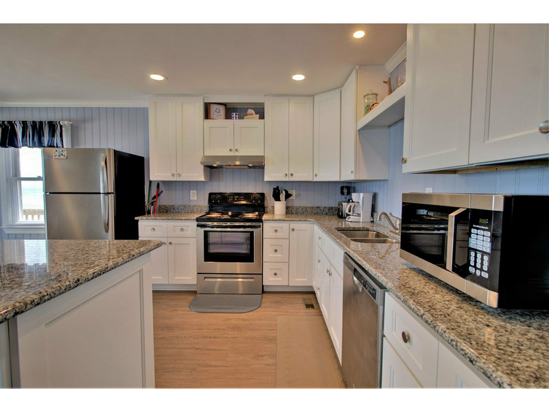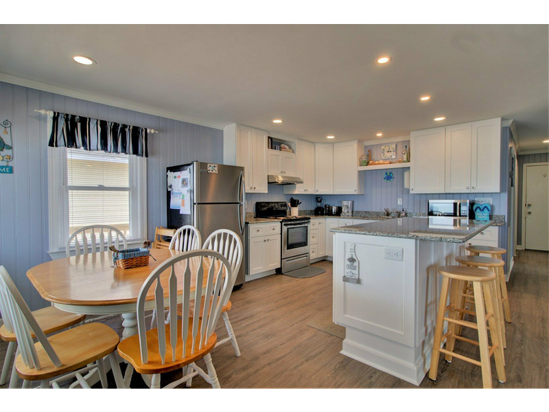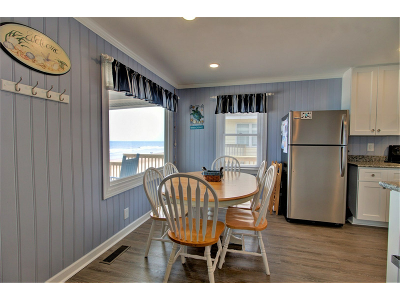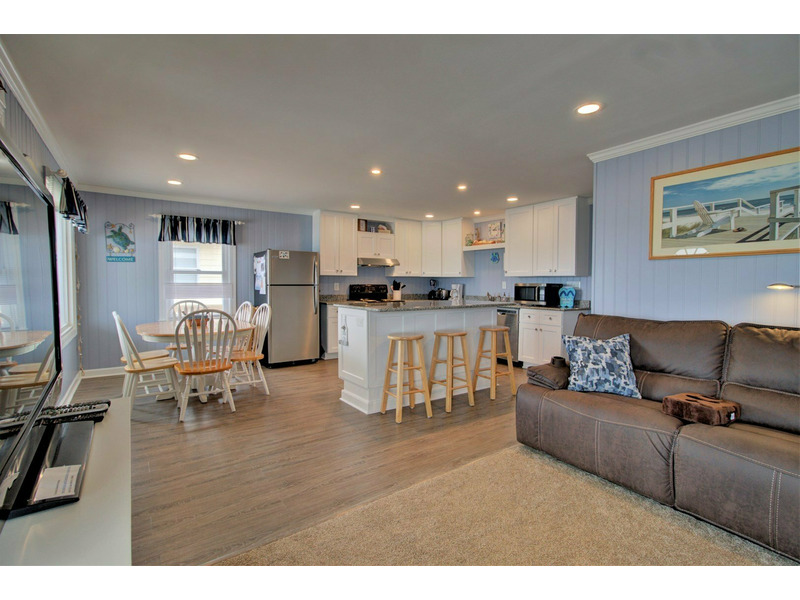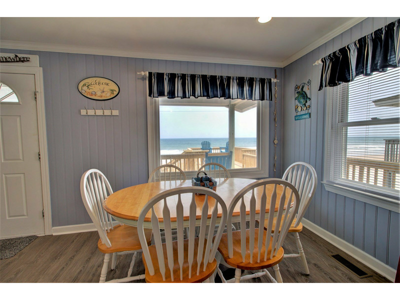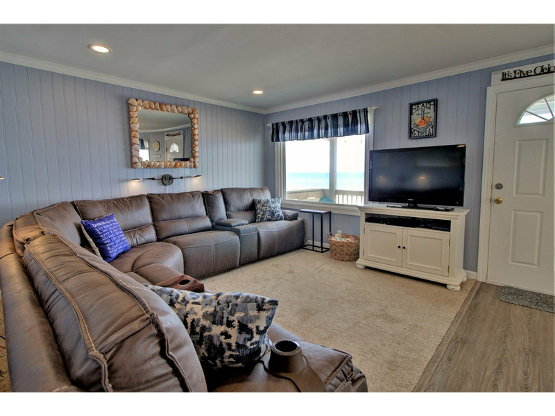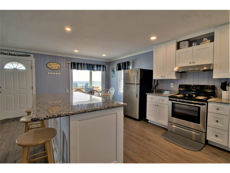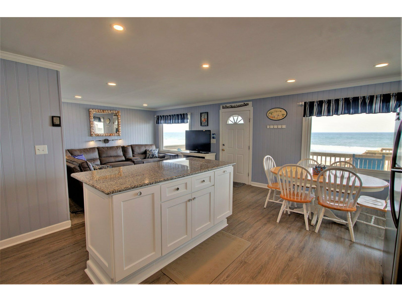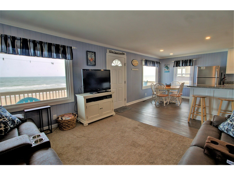 Entering from the front oceanfront deck, you are greeted with an open living room, kitchen, and dining room floor plan. Comfortable seating is provided in the living room for the ultimate in lounging and a large flat screen television is available for your entertainment! Enjoy cooking meals for your family in the kitchen that offers plenty of counter space for meal prep as well as all of the tools for the chef in the family.