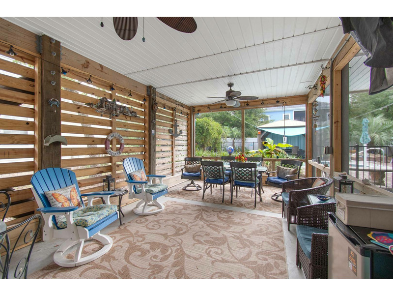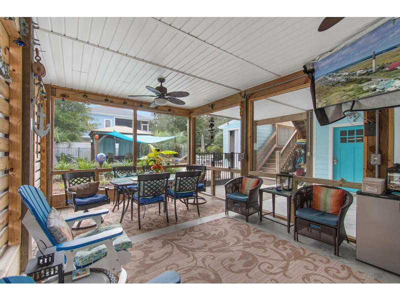 - Ground level screened patio entertainment area with TV, mini-fridge, dining table, lounge chairs, and 2 ceiling fans