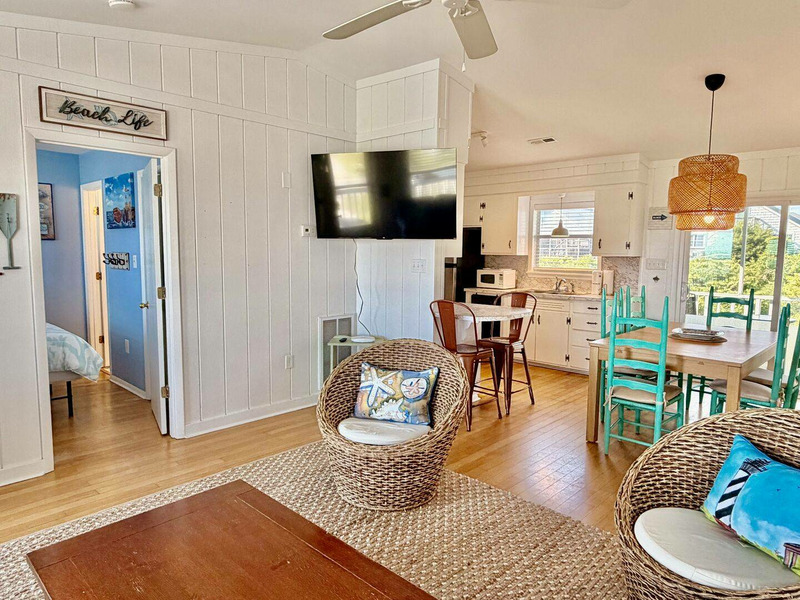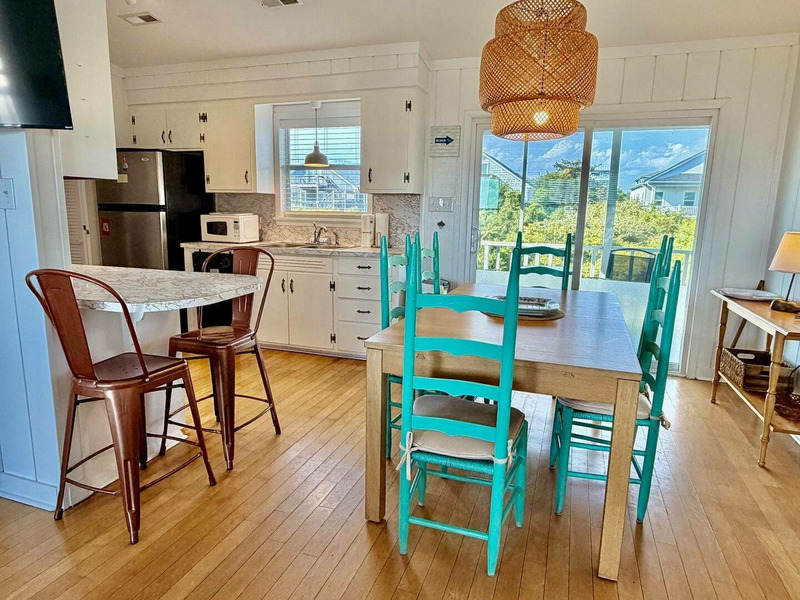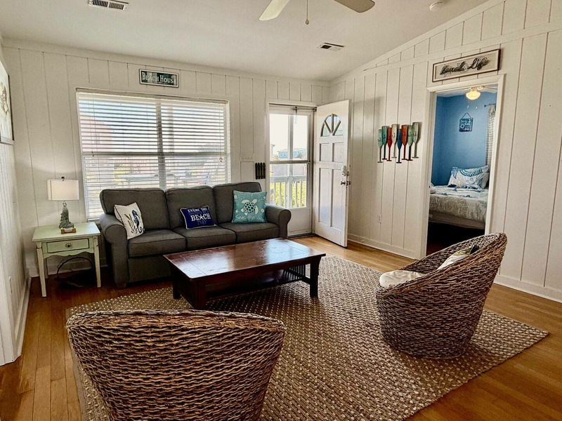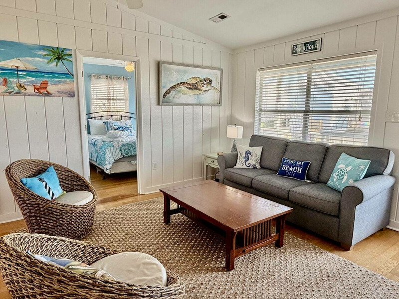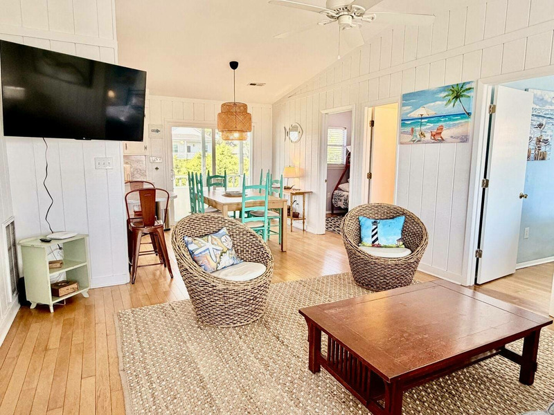 Nestled just a short stroll from the shoreline, this beautifully updated cottage offers stunning ocean views and the kind of sunrises and sunsets that make every day feel special. Inside, the airy open-concept space features a vaulted ceiling, warm hardwood and tile floors, and inviting coastal character throughout. Sip your morning coffee at the breakfast bar or unwind on the covered front porch as the ocean breeze drifts in, then retreat to the cozy screened back porch or fenced backyard for a quiet evening cookout. With thoughtful touches like a fully equipped kitchen, Smart TVs, Wi-Fi, and an outdoor hot-and-cold shower, everything is designed for effortless vacation living. Spend your days exploring nearby parks, local shops, and seaside attractions, or simply relax and soak in the laid-back rhythm of the coastâ"this is Beach Therapy at its finest!