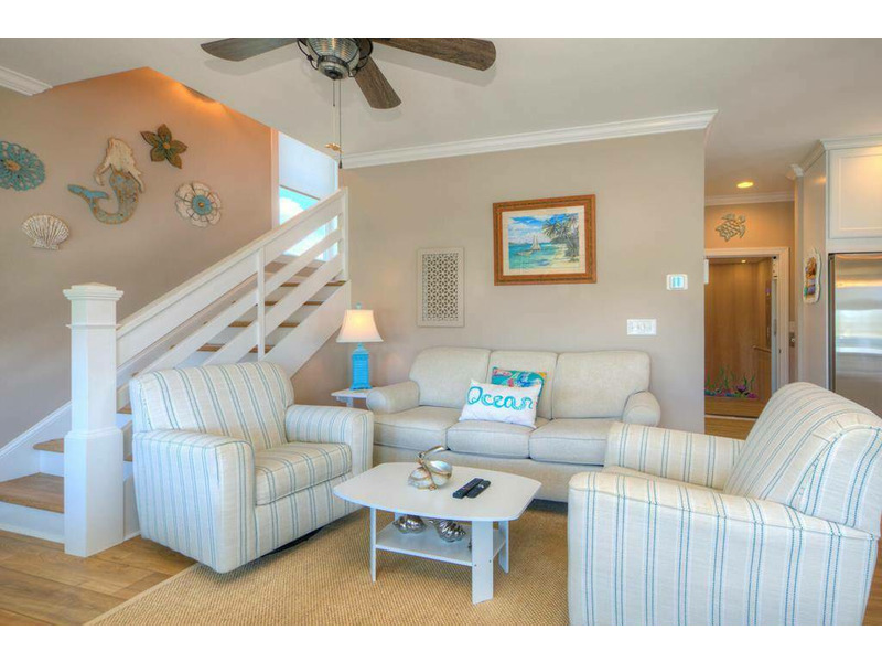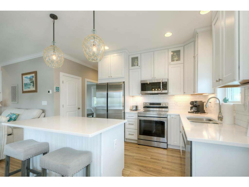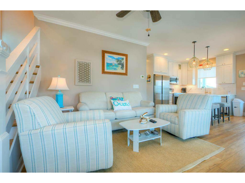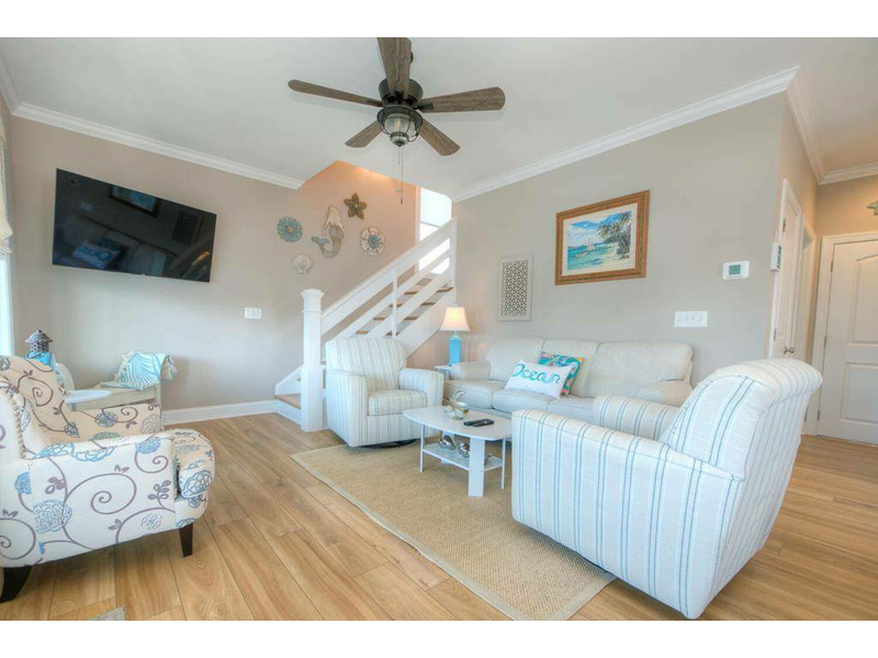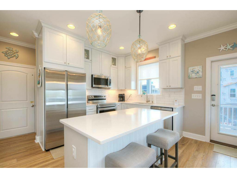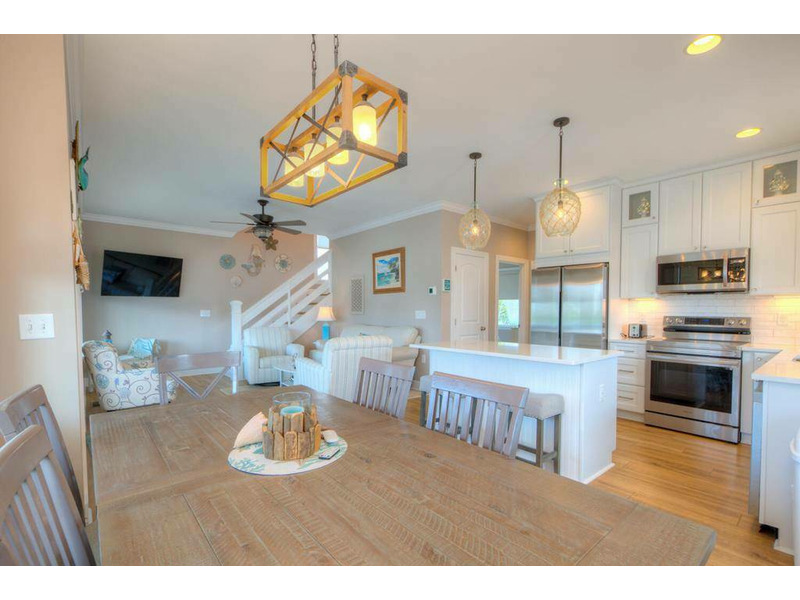 Inside, the first floor greets you with a warm and soothing beach atmosphere that just radiates comfort, calm and relaxation. The open living, dining and kitchen is ideal for gathering with your loved ones and enjoying time together. The chef in the family will love the modern kitchen with stainless-steel appliances and a large island breakfast bar. A Queen primary bedroom with a private bath is also on the first floor.
