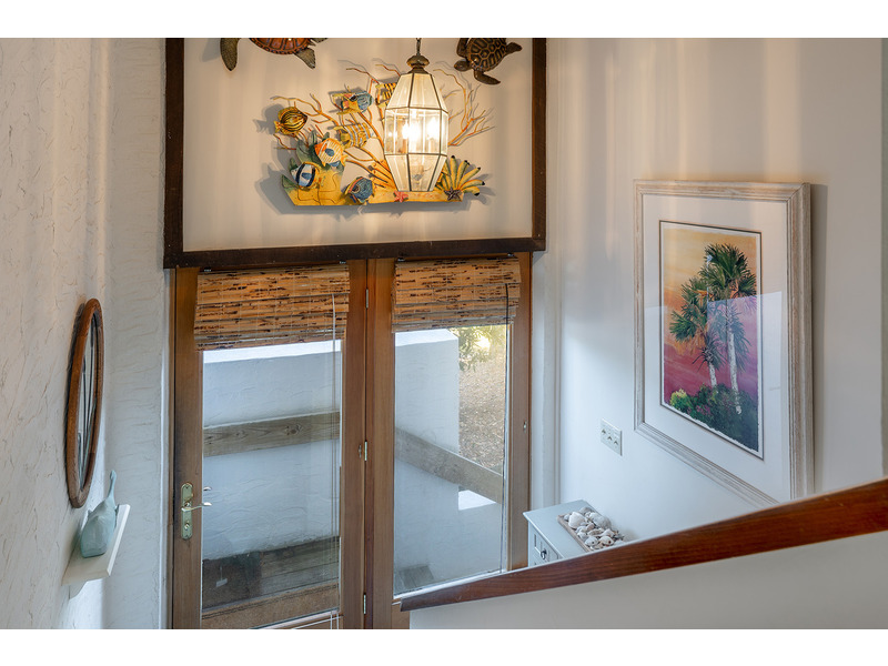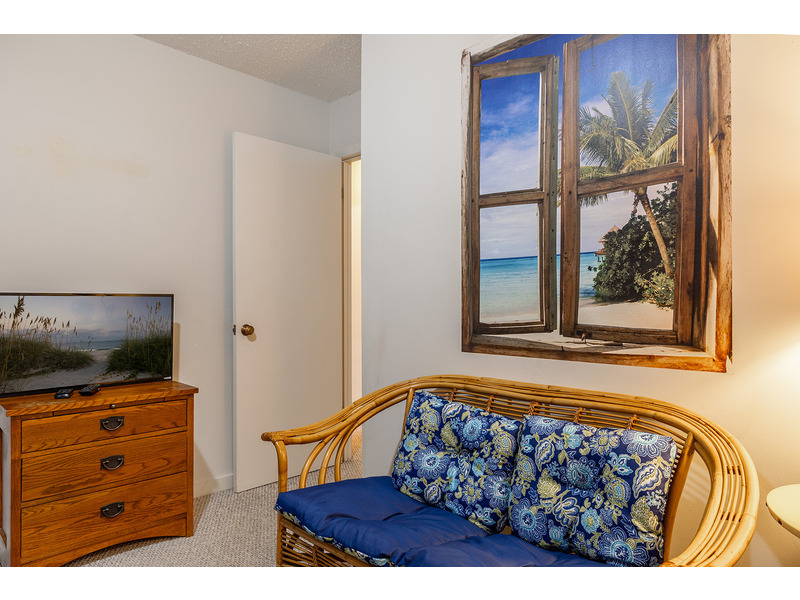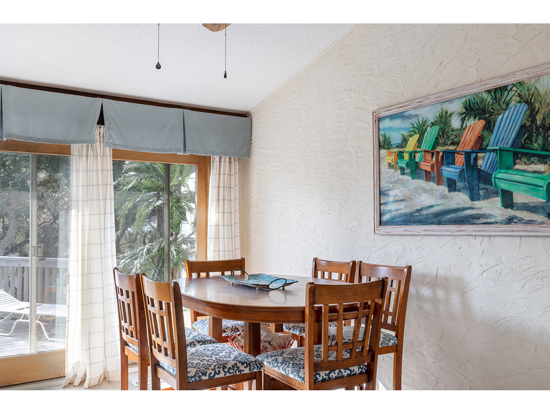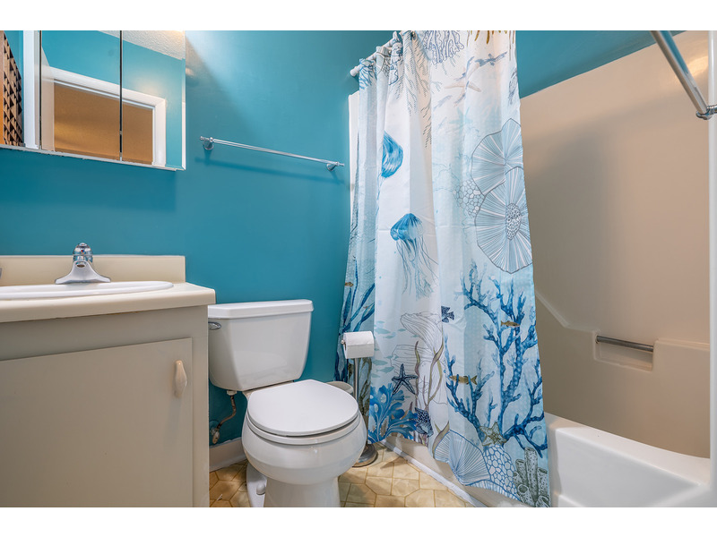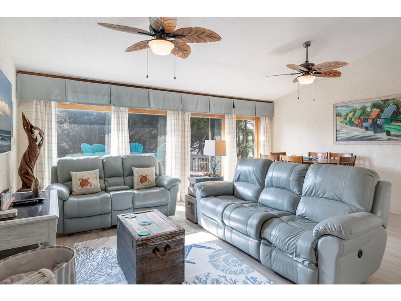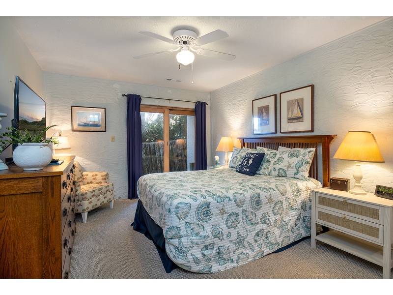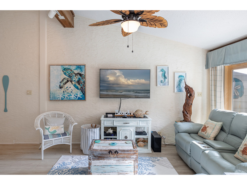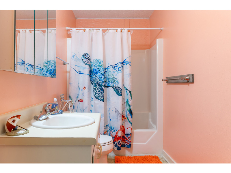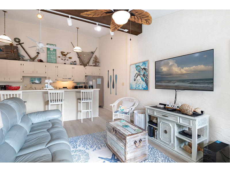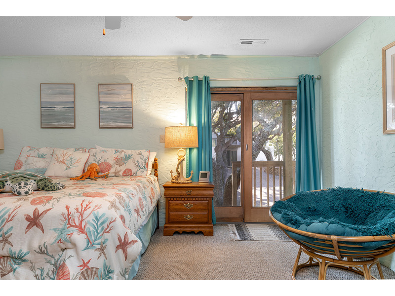 Level One: The kitchen area has a huge breakfast bar and appliances including stove/oven, refrigerator, ice maker, microwave, dishwasher, coffee maker, keurig coffee maker, and filtered drinking water at the sink. Refill those water bottles for free! The Beachy furniture is comfortable with plenty of room for everyone to relax and enjoy the Smart TV with DVD player. Double sliding doors provide access to the deck with comfortable deck furniture. The dining area includes a large table with seating for six. Bedroom # 4 has king sized bed, ceiling fan, Color Cable TV with DVD Player, and a private full bathroom. Sliding doors provide access to the private elevated deck overlooking the grassy common area. Perfect for reading, private time, or checking in at work. An additional full bathroom shares hallway access the bedroom and has locking doors for privacy.