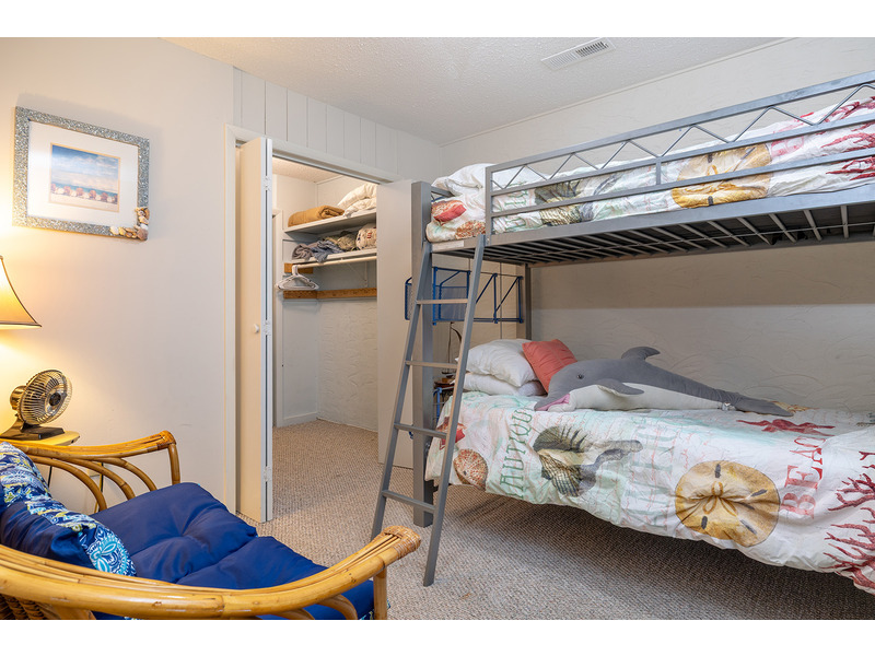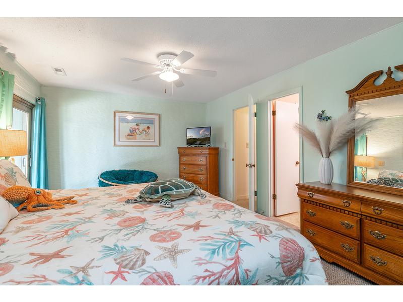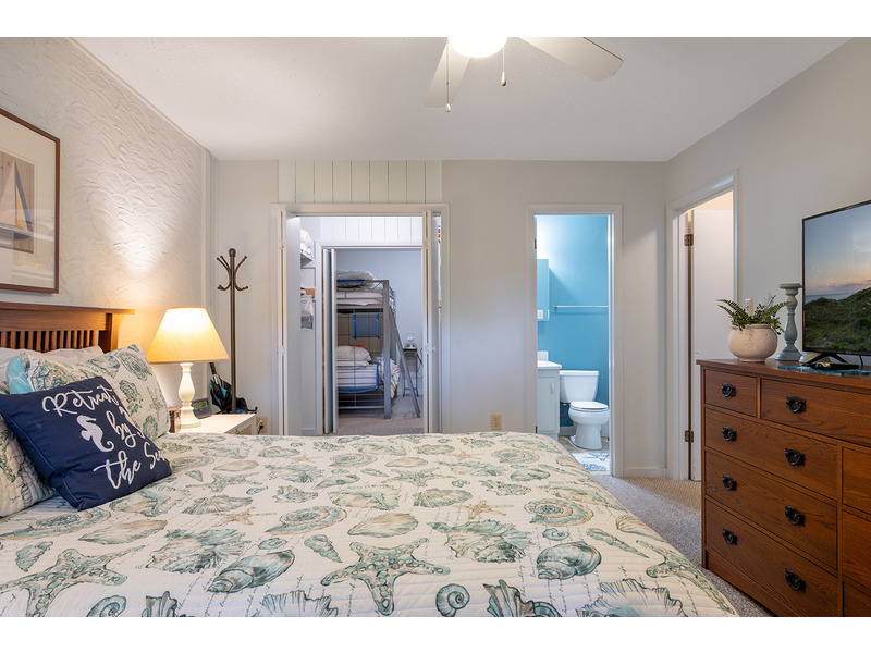 Ground Level: Bedroom # 1 has a King, ceiling fan, Smart TV, sliding door for outside entry, and a private full bathroom. Bedroom # 2 has a Twin Bunk bed, ceiling fan, Smart TV, and shares a large walk in closet with bedroom # 1. Bedroom # 3 has a Queen bed, ceiling fan, Smart TV, sliding door for easy boardwalk beach access. The full bathroom connects to the hallway and the bedroom with locking doors for privacy.
