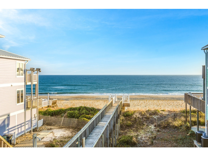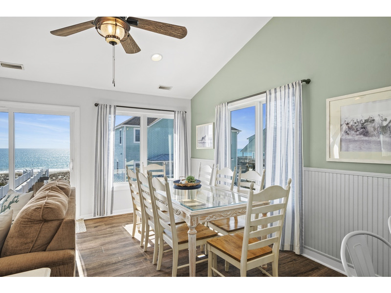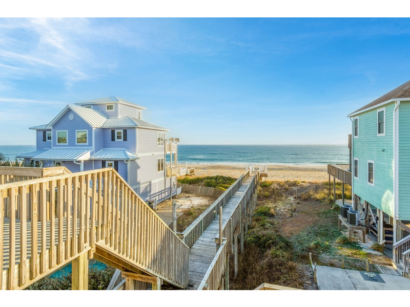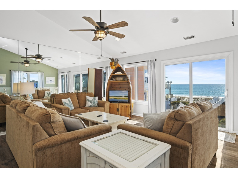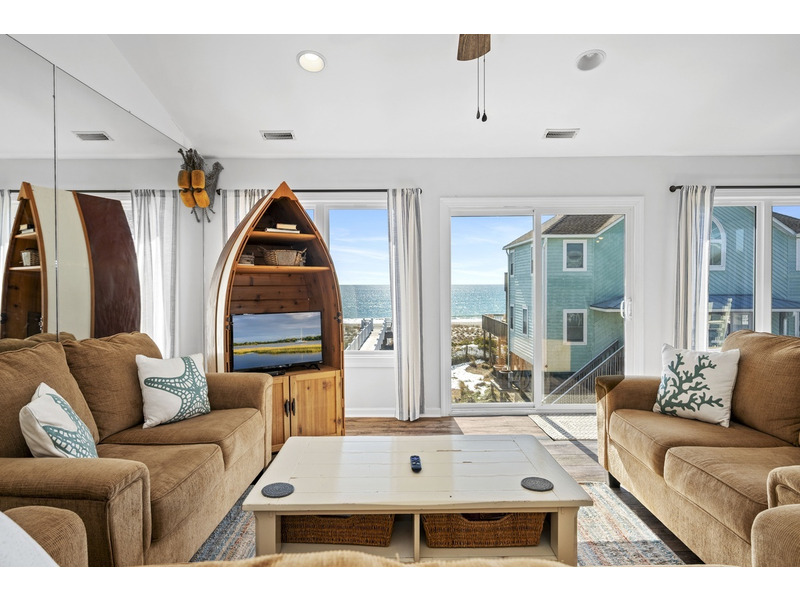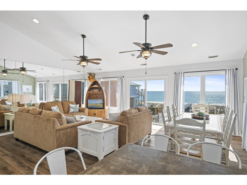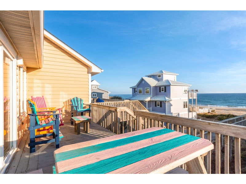 Duplex, West side only. 4 BR, 3 1/2 B. K * Q * Q * Q. Island Club linen service with beds made and No Worries Comforters. Enjoy beautiful views of the ocean from top level living. kitchen and dining area boasting an open floor plan with vaulted ceilings. Fully equipped kitchen with concrete countertops and stainless steel appliances. Wake up to the morning sun and sound of the waves. Primary suite and Queen guest bedrooms offer ocean views and direct access to the covered deck. Lower level offers fourth bedroom with Q bed and separate climate control with its own split unit A/C, second full kitchen and dining area, living area and large flat screen TV, foosball and game tables, and direct access to the beach. Washer/Dryer, 6 Smart TVs, cable TV (Spectrum app), wireless Internet access, Hoshizaki ice machine, ceiling fans throughout. Hair dryers provided. Each level of the home accesses the newly constructed (2026) composite board deck with all new PVC railing. The new deck doubles the space for outdoor dining and lounging from previous years. Regulation horseshoe pits and corn hole boards. Enclosed hot/cold outside shower, stainless steel park-style charcoal grill. Great location allows approximately a one mile beach walk to the point at the far western end of Emerald Isle for breathtaking views of beautiful sunsets, pristine natural settings and excellent shell collecting; or walk east on the beach a little over a mile to the historic Bogue Inlet pier which offers a lively setting with access to dining, fishing and other beach activities. Keyless entry. Right off of Coast Guard Drive, this property offers easy access on and off of the island even during the busiest times. Minutes to shopping, groceries, and restaurants. Situated on an oceanfront peg lot. Weekly only. No smoking. No pets. 9423 Ocean Drive.