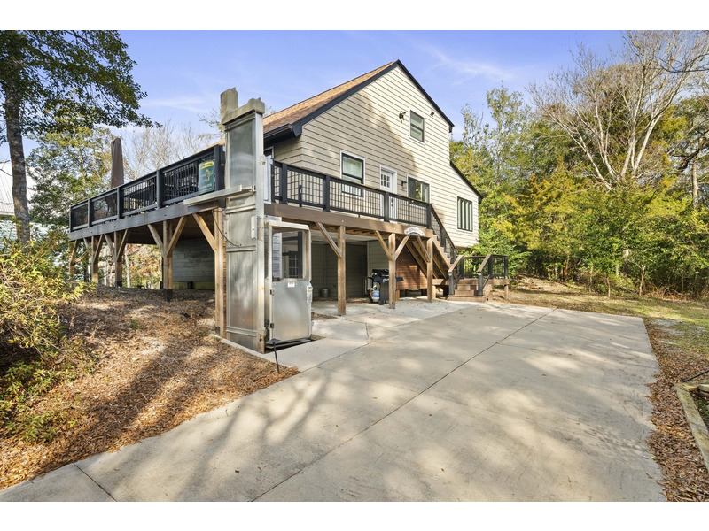 Middle Row Cottage, 3 BR, 3 B. Q * Q * 2D * 2S. Island Club Linen service with beds made and No Worries Comforters. Located in Sea Dunes, this home is a short five-minute walk to the beach access, Emerald Woods Park, the bike path, shopping, restaurants and grocery stores. A total renovation was completed in 2022 including a large private deck space with an exterior passenger lift elevator from ground level to the first level deck, 32 inch doors and grab bars in 2 bathrooms. The deck includes new piers and composite decking, a gas fire table, large patio umbrella and an outdoor dining table for up to eight. This very charming home includes a wide, bright and modern kitchen with granite countertops, dishwasher, side by side refrigerator, slim-line microwave and stainless sink looking out the large picture window. The spacious dining room includes seating for eight, two large picture windows overlooking the beautiful, wooded lot and a wall entertainment center that includes a coffee bar, beverage station, wine fridge and a large Smart TV. Hard surface flooring throughout and a first level primary suite includes a queen size bed, Smart TV and private tiled bath. The family room opens to a high, vaulted ceiling, twinned ceiling fans and a large Smart TV to relax. A ground level game-room includes a mini-fridge, foosball table, electronic dartboard and a large Smart TV to game or enjoy movies after a long day at the beach. The ground level laundry room includes a washer and gas dryer. Plenty of parking that can even accommodate your boat. Gas grill, hot/cold outside shower. Everything about this home will add to your perfect family vacation at the beach. Automatic/motion sensing security spotlight/camera protects the Driveway/Front Entrance. No smoking. Pets allowed with a $175 non-refundable fee per pet (2 maximum). 134 Sandcastle Drive.