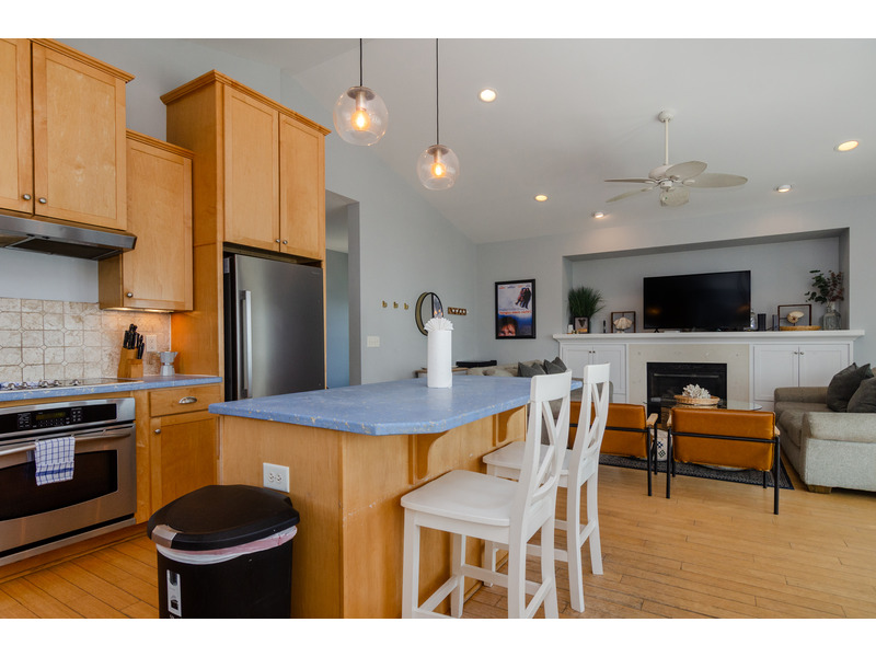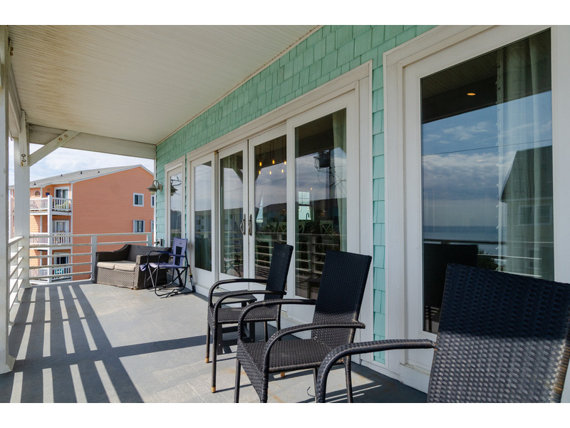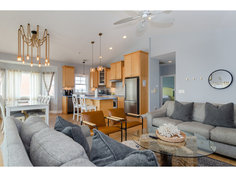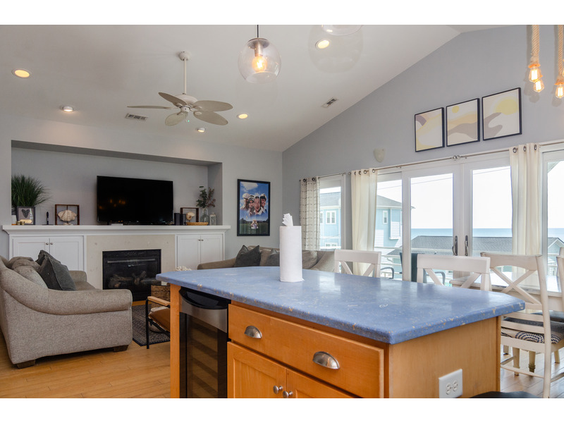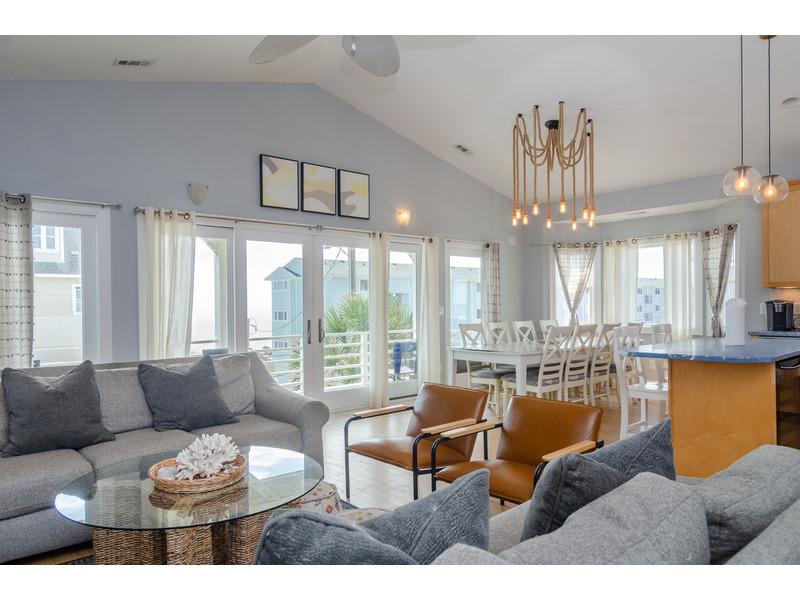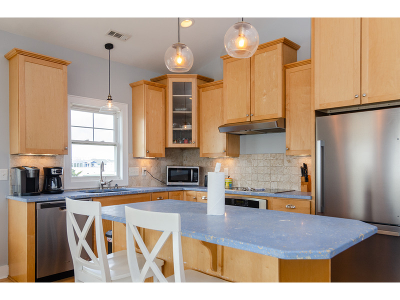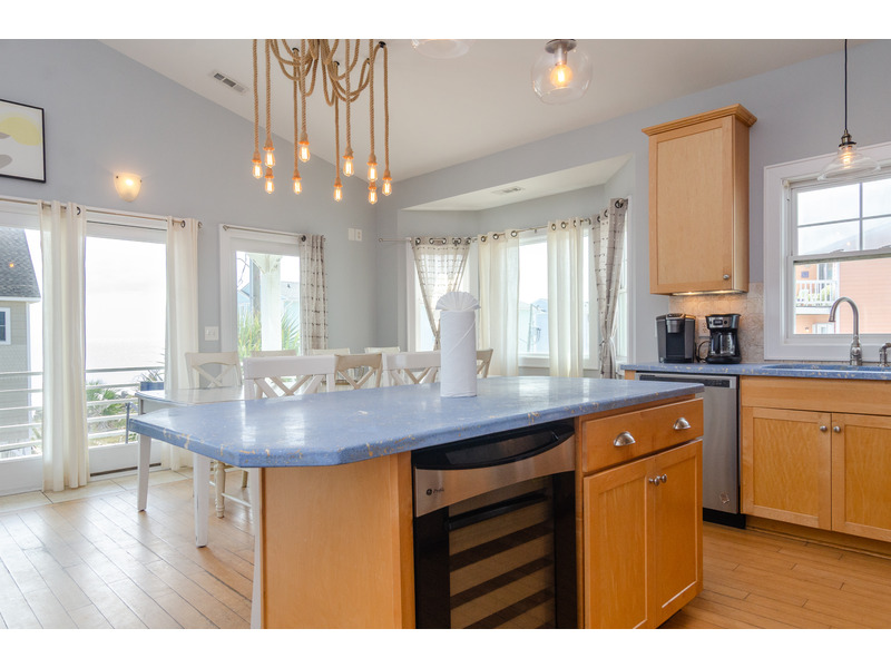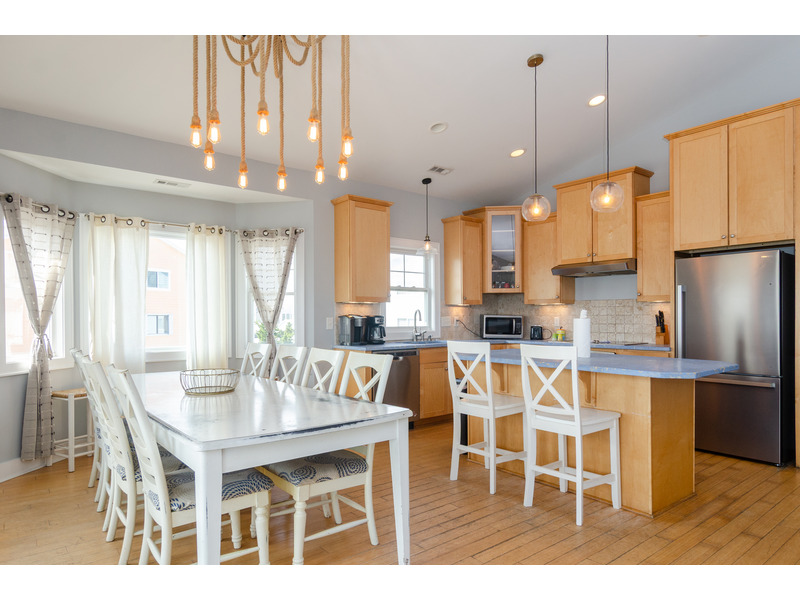 The top floor has two more bedrooms and the main living area. The fifth bedroom has a Queen bed. The sixth bedroom has a Queen, a bathroom that is also accessible from the hall, and a private, stand-up deck. The main living area boasts a large, open floor plan with the dining area and kitchen. East-facing windows and sliding glass doors to the deck create a sunny, cheery atmosphere. Enjoy the sunrise over the ocean while you drink your morning coffee or have breakfast on the deck where you can easily "Dolphin Watch" for hours! The kitchen has all the appliances you will need to prepare your favorite meals: oven, electric range, microwave, and double-door fridge with freezer drawer. The dining table has seating for eight, and the island has three bar stools - eat in or order takeout from one of the island's many fantastic restaurants!
